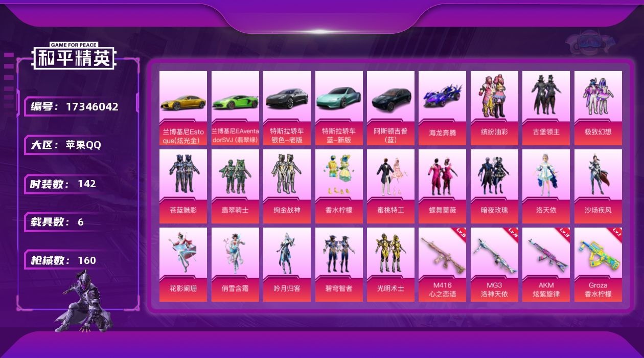 [17346042]【1131】苹果 手Q-17粉装-4特效枪-6载具-2粉色飞行器-66062热力值-6王牌印记-142套装-160枪皮