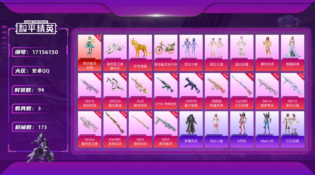 [17156150]【1184】安卓 手Q-1神装-5粉装-13特效枪-3载具-9粉色飞行器-61965热力值-8王牌印记-94套装-173枪皮