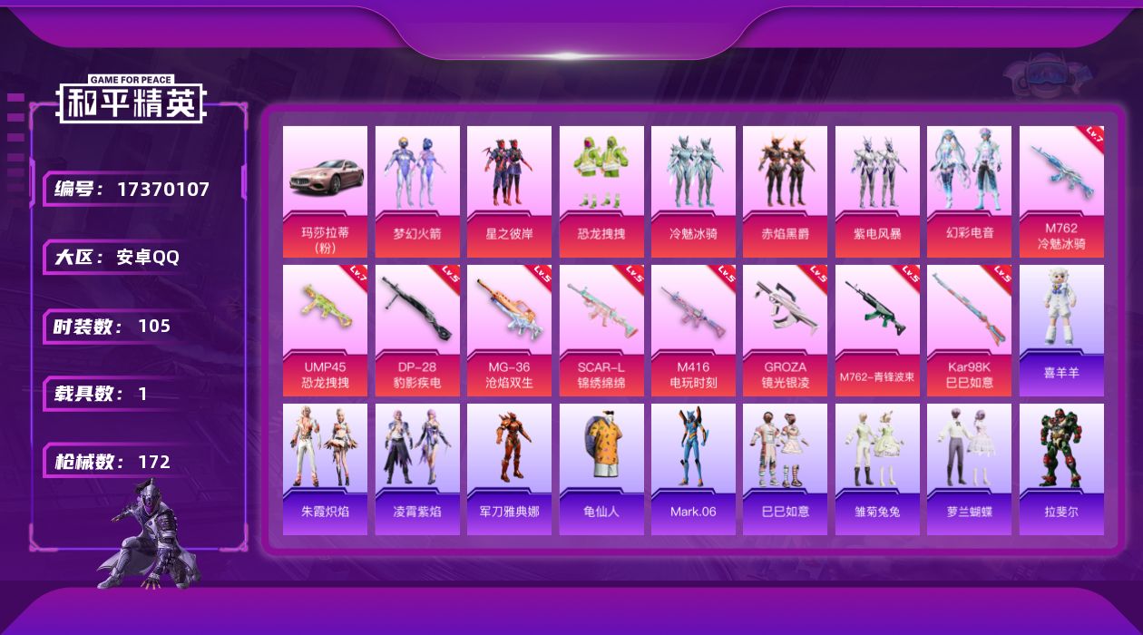 [17370107]【1189】安卓 手Q-7粉装-9特效枪-1载具-3粉色飞行器-51729热力值-8王牌印记-105套装-172枪皮 【热门品类】:粉装-梦幻火箭,角色-军刀雅典娜,套装-龟仙人,角色-Mark.06 【粉色载具】:玛莎拉蒂Ghibli(粉) 【粉色套装】:粉装-梦幻火箭,粉装-星之彼岸,粉装-恐龙拽拽,粉装-冷魅冰骑,粉装-赤焰黑爵,粉装-紫电风暴,粉装-幻彩电音 【粉色枪皮等级】:SCAR-L-锦绣绵绵(五级),M416-电玩时刻(五级),GROZA-镜光银凌(五级),M762-冷魅冰骑(七级),M762-青锋波束(五级),UMP45-恐龙拽拽(七级),Kar98K-巳巳如意(五级),DP-28-豹影疾电(五级),MG-36-沧焰双生(五级) 【粉色枪皮】:SCAR-L-锦绣绵绵,M416-电玩时刻,GROZA-镜光银凌,M762-冷魅冰骑,M762-青锋波束,UMP45-恐龙拽拽,Kar98K-巳巳如意,DP-28-豹影疾电,MG-36-沧焰双生 【粉色飞行器】:星夜魔法师飞行翼,闪光银龙飞行器,镜域双华-灵镜之阶 【粉色降落伞】:梦幻火箭降落伞,洛神天依降落伞,恐龙拽拽降落伞,冷魅冰骑降落伞,旋转彩虹降落伞,甜心首席降落伞,镜域双华降落伞,金丰海韵降落伞,临安公主降落伞,智耀战神降落伞,幻彩电音降落伞,绯穹魔姬降落伞,喜羊羊与灰太狼降落伞 【稀有套装】:套装-龟仙人,套装-巳巳如意,套装-雏菊兔兔,套装-萝兰蝴蝶,角色-拉斐尔,套装-糖糖葫芦,套装-青团波波,套装-棉花软糖,角色-临安公主,角色-怀庆长公主,套装-燕燕于飞,套装-鱼渊荷华,套装-粉恋花,套装-紫幽梦,套装-蓝冰羽,套装-霓虹热舞,套装-极速光影,套装-彩虹兔,套装-云朵鹅,套装-雪绒豹,角色-绛羽幽主,套装-朱霞炽焰,套装-凌霄紫焰,玩偶服-喜羊羊 【稀有枪皮】:AKM-墨染幽兰,AKM-恐龙拽拽,AKM-霓虹街区,M16A4-幻世战舞者,M16A4-甜心亚梦,SCAR-L-炫彩节奏,SCAR-L-玉兔迎春,M416-暗夜行者,M416-糯团青竹,M416-红色方程式,GROZA-恐龙拽拽,GROZA-治愈之星,AUG-天降萌叽,AUG-耀粉歌者,QBZ-彩虹符号,QBZ-未来歌姬,M762-奇异狩猎者,M762-云朵鹅,G36C-冷魅冰骑,G36C-炙焰牛王,AC-VAL-天降萌叽,AC