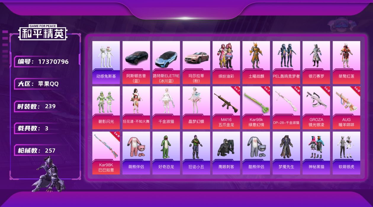【粉色枪皮等级】:M416-五爪金龙(七级),GROZA-镜光银凌(五级),AUG-暖羊咩咩(五级),Kar98K-绿意幻情(七级),Kar98K-巳巳如意(五级),DP-28-千金淑猫(六级)