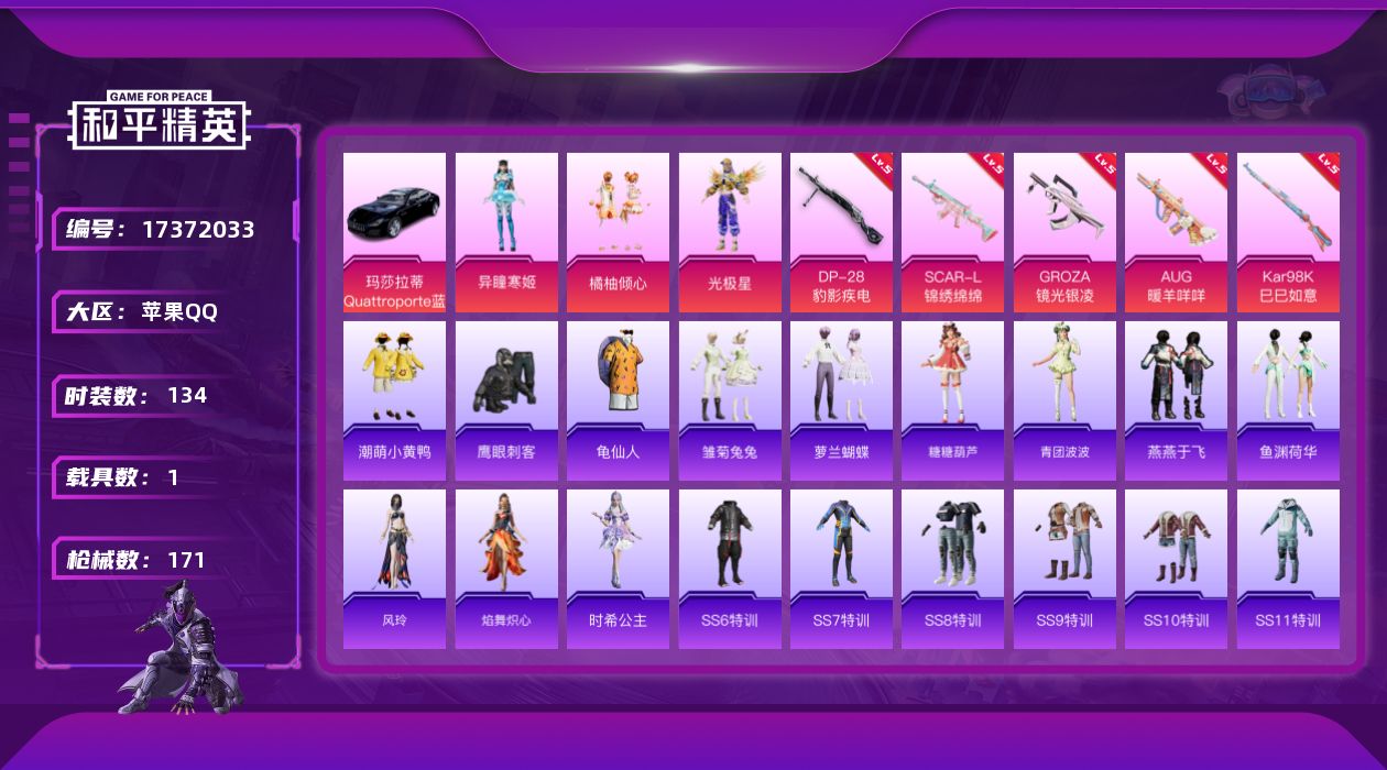 [17372033]【1199】苹果 手Q-4粉装-5特效枪-1载具-3粉色飞行器-52176热力值-10王牌印记-134套装-171枪皮 【热门品类】:套装-龟仙人,套装-潮萌小黄鸭 【粉色载具】:玛莎拉蒂Quattroporte(夜幕蓝) 【粉色套装】:粉装-橘柚倾心,角色-光极星,角色-异瞳寒姬 【粉色枪皮等级】:SCAR-L-锦绣绵绵(五级),GROZA-镜光银凌(五级),AUG-暖羊咩咩(五级),Kar98K-巳巳如意(五级),DP-28-豹影疾电(五级) 【粉色枪皮】:SCAR-L-锦绣绵绵,GROZA-镜光银凌,AUG-暖羊咩咩,Kar98K-巳巳如意,DP-28-豹影疾电 【粉色飞行器】:彩虹独角兽飞行器,月下星之子飞行器 【粉色降落伞】:筑梦精灵降落伞,甜梦小狐降落伞,旋转彩虹降落伞,圣堂之誓降落伞,千金淑猫降落伞,鬼刀降落伞,星穹咏叹调降落伞 【稀有套装】:套装-龟仙人,套装-雏菊兔兔,套装-萝兰蝴蝶,套装-糖糖葫芦,套装-青团波波,套装-燕燕于飞,套装-鱼渊荷华,角色-风玲,套装-焰舞炽心,角色-时希公主 【稀有枪皮】:AKM-星之彼岸,AKM-灼热熔岩,AKM-破晓战魂,AKM-霓虹街区,M16A4-红色方程式,M16A4-魔法学院,SCAR-L-炫彩节奏,SCAR-L-玉兔迎春,SCAR-L-红色方程式,M416-夜灯,M416-糯团青竹,M416-紫翼圣骑,M416-红色方程式,M416-蓝色火焰,GROZA-紫翼圣骑,GROZA-黑色刀锋,AUG-甜蜜菠萝,AUG-耀粉歌者,QBZ-神秘黑猫,QBZ-飞驰魅影,M762-快乐主宰,M762-拳皇97,M762-橘柚倾心,M762-牛气冲天,AC-VAL-天降萌叽,AC-VAL-快闪甜心,蜜獾-天降萌叽,蜜獾-娇憨猪猪,Famas-月下星之子,UZI-啾咪啾咪,UZI-娇憨猪猪,UZI-炫彩节奏,UZI-生命誓言,UMP45-夜灯,UMP45-生命誓言,UMP45-蓝色火焰,Vector-彩虹符号,Vector-生命誓言,Vector-黑色刀锋,汤姆逊-天降萌叽,汤姆逊-炫彩节奏,P90-快闪甜心,P90-筑梦精灵,P90-飞驰魅影,P90-巳巳如意,Kar98K-彩虹符号,Kar98K-炫彩节奏,Kar98K-红色方程式,Kar98K-飞驰魅影,M24-炫彩节奏,SKS-夜灯,SKS-炫彩节奏,VSS-黑