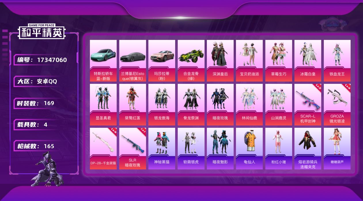 [17347060]【1214】安卓 手Q-13粉装-4特效枪-4载具-2粉色飞行器-66844热力值-6王牌印记-169套装-165枪皮 【热门品类】:套装-SS1特训,套装-龟仙人,套装-粉红小猪,熔岩游骑兵面罩,熔岩游骑兵连帽夹克 【粉色载具】:特斯拉Roadster(水滴蓝),兰博基尼Estoque(银翼灰),玛莎拉蒂Ghibli(粉),合金龙骨(绿),空客H135-蔚蓝之翼 【粉色套装】:粉装-深渊皇后,粉装-宝贝奶油派,粉装-草莓生巧,粉装-冰霜白皇,粉装-铁血龙王,粉装-显圣真君,粉装-桀骜红莲,粉装-银龙傲海,粉装-骨龙祭渊,粉装-暗夜玫瑰,粉装-林间仙鹿,粉装-山涧鹿灵 【粉色枪皮等级】:SCAR-L-机甲封神(五级),GROZA-镜光银凌(四级),SLR-暗夜玫瑰(一级),DP-28-千金淑猫(四级) 【粉色枪皮】:SCAR-L-机甲封神,GROZA-镜光银凌,SLR-暗夜玫瑰,DP-28-千金淑猫 【粉色飞行器】:深海曼妙飞行器,镜光幻境飞行翼 【粉色降落伞】:深海曼妙降落伞,春暖花开降落伞,花间之火降落伞,夏日绵绵冰降落伞,焰龙焚天降落伞,暗夜玫瑰降落伞,林间仙鹿降落伞,千面幻镜降落伞,飒粉甜心降落伞 【稀有套装】:套装-龟仙人,套装-糖糖葫芦,套装-青团波波 【稀有枪皮】:AKM-夜灯,AKM-奇异狩猎者,AKM-彩虹符号,AKM-破晓战魂,AKM-萌趣颜团子,AKM-霓虹街区,M16A4-凝视深渊,M16A4-幻世战舞者,M16A4-生命誓言,M16A4-千金淑猫,SCAR-L-夏日绵绵冰,SCAR-L-暗夜玫瑰,SCAR-L-炫彩节奏,SCAR-L-玉兔迎春,SCAR-L-生命誓言,M416-糯团青竹,M416-红色方程式,M416-蓝色火焰,GROZA-懵萌河马,GROZA-林间仙鹿,GROZA-生命誓言,GROZA-田园牧歌,GROZA-黑色刀锋,AUG-焰龙焚天,QBZ-彩虹符号,QBZ-电玩视界,M762-天降萌叽,M762-奇异狩猎者,M762-深海曼妙,M762-牛气冲天,M762-瑞龙福将,M762-镭射皇者,Mk47-林间仙鹿,Mk47-百万伏特,G36C-懵萌河马,G36C-时空追击者,G36C-暗夜玫瑰,G36C-花间之火,AC-VAL-天降萌叽,蜜獾-垂柳戏鸭,蜜獾-天降萌叽,蜜獾-娇憨猪猪,UZI-众神之王,UZI-娇憨猪猪,UZ