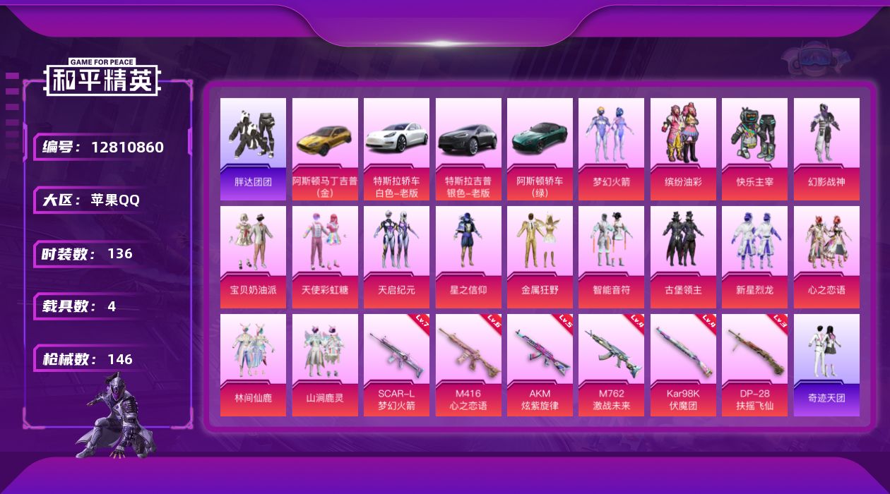 [12810860]【1216】苹果 手Q-15粉装-6特效枪-4载具-4粉色飞行器-67098热力值-1王牌印记-136套装-146枪皮 【热门品类】:粉装-梦幻火箭,粉装-缤纷油彩,套装-胖达团团,套装-忍者信条 【粉色载具】:特斯拉Model 3(珍珠白),特斯拉Model X(冷光银),阿斯顿马丁DBS(绿),阿斯顿马丁DBX(金) 【粉色套装】:粉装-快乐主宰,粉装-幻影战神,粉装-宝贝奶油派,粉装-天使彩虹糖,粉装-梦幻火箭,粉装-天启纪元,粉装-星之信仰,粉装-金属狂野,粉装-智能音符,粉装-缤纷油彩,粉装-古堡领主,粉装-新星烈龙,粉装-心之恋语,粉装-林间仙鹿,粉装-山涧鹿灵 【粉色枪皮等级】:AKM-炫紫旋律(五级),SCAR-L-梦幻火箭(七级),M416-心之恋语(六级),M762-激战未来(四级),Kar98K-伏魔团(四级),DP-28-扶摇飞仙(三级) 【粉色枪皮】:AKM-炫紫旋律,SCAR-L-梦幻火箭,M416-心之恋语,M762-激战未来,Kar98K-伏魔团,DP-28-扶摇飞仙 【粉色飞行器】:梦幻火箭飞行器,炫紫旋律飞行器,古堡领主飞行器,伏魔团飞行器 【粉色降落伞】:快乐主宰降落伞,幻影战神降落伞,精灵迷巫降落伞,梦幻火箭降落伞,天启纪元降落伞,星之信仰降落伞,炫紫旋律降落伞,古堡领主降落伞,伏魔团降落伞,四圣焕新降落伞,心之恋语降落伞,烈焰拳霸降落伞,林间仙鹿降落伞,绯穹魔姬降落伞 【稀有枪皮】:AKM-天启纪元,AKM-彩虹符号,AKM-折纸暴龙,AKM-星之信仰,AKM-虎虎生威,AKM-霓虹街区,M16A4-幻世战舞者,M16A4-快乐主宰,M16A4-机械英豪,M16A4-蓝色火焰,M16A4-魔法学院,SCAR-L-暗夜玫瑰,SCAR-L-炫彩节奏,SCAR-L-玉兔迎春,SCAR-L-繁花小夜曲,M416-仓鼠灰灰,M416-快乐主宰,M416-绿野极光,M416-蓝色火焰,M416-魔法学院,GROZA-暗夜武装,GROZA-治愈之星,GROZA-黑色刀锋,AUG-幻影战神,AUG-魔法学院,QBZ-原初圣火,QBZ-彩虹符号,M762-快乐主宰,M762-折纸暴龙,M762-拳皇97,M762-牛气冲天,M762-瑞龙福将,M762-甜心宝贝,M762-镭射皇者,Mk47-林间仙鹿,G36C-时空追击者,UZI-古堡领主