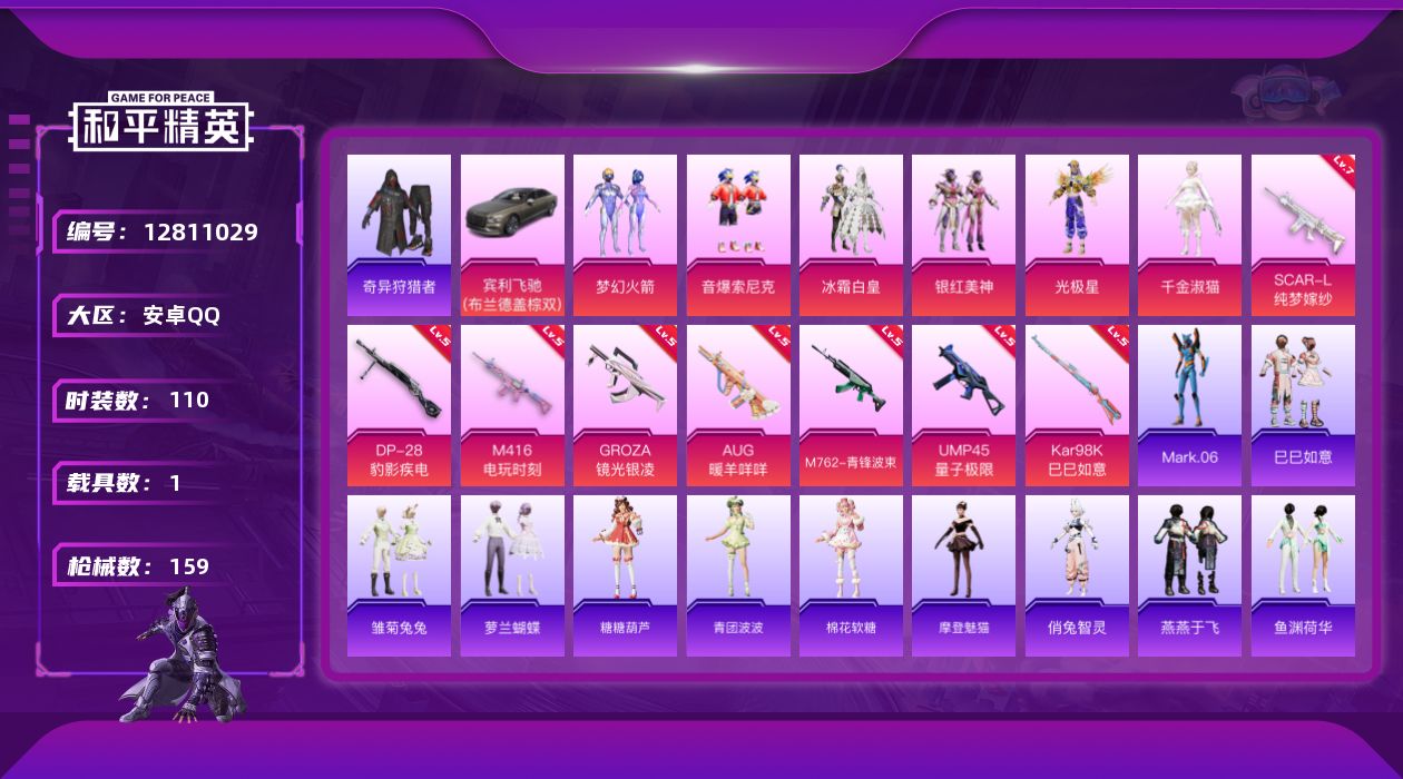 [12811029]【1218】安卓 手Q-6粉装-8特效枪-1载具-1粉色飞行器-46968热力值-10王牌印记-110套装-159枪皮