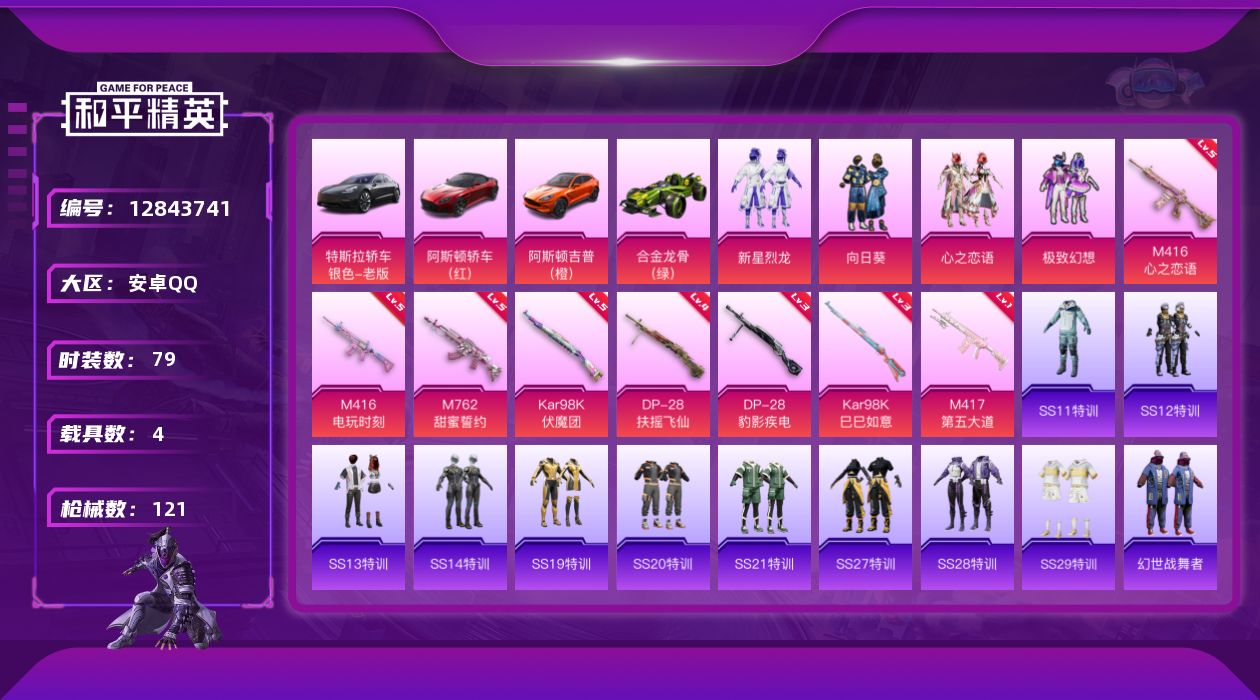 [12843741]【1227】安卓 手Q-4粉装-8特效枪-4载具-0粉色飞行器-45620热力值-3王牌印记-79套装-121枪皮 【粉色载具】:特斯拉Model 3(冷光银),阿斯顿马丁DBS(红),阿斯顿马丁DBX(橙),合金龙骨(绿) 【粉色套装】:粉装-新星烈龙,粉装-向日葵,粉装-心之恋语,粉装-极致幻想 【粉色枪皮等级】:M416-心之恋语(五级),M416-电玩时刻(五级),M762-甜蜜誓约(五级),Kar98K-伏魔团(五级),Kar98K-巳巳如意(三级),M417-第五大道(一级),DP-28-扶摇飞仙(四级),DP-28-豹影疾电(三级) 【粉色枪皮】:M416-心之恋语,M416-电玩时刻,M762-甜蜜誓约,Kar98K-伏魔团,Kar98K-巳巳如意,M417-第五大道,DP-28-扶摇飞仙,DP-28-豹影疾电 【粉色降落伞】:神秘黑猫降落伞,古堡领主降落伞,伏魔团降落伞,繁花小夜曲降落伞,甜蜜誓约降落伞,四圣焕新降落伞,心之恋语降落伞,扶摇飞仙降落伞,歌者泠鸢降落伞,精灵梦叶罗丽降落伞,守护天翼降落伞 【稀有枪皮】:AKM-夜灯,AKM-灼热熔岩,AKM-玉龙,M16A4-幻世战舞者,M16A4-机械英豪,M16A4-红色方程式,SCAR-L-炫彩节奏,SCAR-L-玉兔迎春,SCAR-L-繁花小夜曲,SCAR-L-黄金龙骨,M416-蓝色火焰,GROZA-治愈之星,AUG-天降萌叽,AUG-耀粉歌者,QBZ-原初圣火,QBZ-彩虹符号,QBZ-神秘黑猫,M762-动感兔斯基,M762-天降萌叽,M762-牛气冲天,G36C-不夜海上花,蜜獾-天降萌叽,UZI-古堡领主,UZI-天降萌叽,UMP45-生命誓言,Vector-焰鹰斗篷,Vector-彩虹符号,Vector-治愈之星,Vector-生命誓言,汤姆逊-银刃赛罗,野牛-机械英豪,MP5K-繁花小夜曲,Kar98K-古堡领主,Kar98K-彩虹符号,Kar98K-炫彩节奏,M24-治愈之星,AWM-焰鹰斗篷,SKS-心之恋语,SKS-炫彩节奏,VSS-繁花小夜曲,Mini14-原初圣火,Mini14-炫彩节奏,Mk14-治愈之星,Win94-机械英豪,QBU-不夜海上花,AMR-墨龙九天,S686-不夜海上花,S686-生命誓言,S1897-天启纪元,S1897-神秘黑猫,S12K-玩趣呆