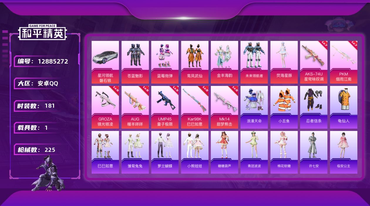 [12885272]【1360】安卓 手Q-6粉装-7特效枪-1载具-2粉色飞行器-73594热力值-11王牌印记-181套装-225枪皮 【热门品类】:套装-浪漫天命,套装-小丑鱼,套装-忍者信条,套装-龟仙人 【粉色载具】:星河领航(磐石银) 【粉色套装】:粉装-苍蓝魅影,粉装-蓝莓炮弹,粉装-鸾凤武仙,粉装-金丰海韵,粉装-未来领航者,角色-荧海星豚 【粉色枪皮等级】:GROZA-镜光银凌(五级),AUG-暖羊咩咩(五级),UMP45-量子极限(五级),AKS-74U-星穹咏叹调(七级),Kar98K-巳巳如意(五级),Mk14-甜梦熊击(五级),PKM-江南烟雨(七级) 【粉色枪皮】:GROZA-镜光银凌,AUG-暖羊咩咩,UMP45-量子极限,AKS-74U-星穹咏叹调,Kar98K-巳巳如意,Mk14-甜梦熊击,PKM-江南烟雨 【粉色飞行器】:青春物语飞行器,终晖之翼飞行器 【粉色降落伞】:锦绣火鲤降落伞,夏日绵绵冰降落伞,香水柠檬降落伞,星之彼岸降落伞,烈焰拳霸降落伞,风花雪月降落伞,碧影闪光降落伞,垂柳戏鸭降落伞,飒粉甜心降落伞,江南烟雨降落伞,临安公主降落伞,雪月幻音降落伞,智耀战神降落伞,星穹咏叹调降落伞 【稀有套装】:套装-龟仙人,套装-巳巳如意,套装-雏菊兔兔,套装-萝兰蝴蝶,套装-小熊娃娃,套装-糖糖葫芦,套装-青团波波,套装-棉花软糖,角色-许七安,角色-临安公主,套装-燕燕于飞,套装-鱼渊荷华,套装-粉恋花,套装-紫幽梦,套装-蓝冰羽,角色-瑰梦爱神,套装-星影赞美诗,套装-星渊小夜曲,套装-彩虹兔,套装-云朵鹅,套装-雪绒豹,角色-乐音,套装-蜜露汐语 【稀有枪皮】:AKM-夜灯,AKM-彩虹符号,AKM-灼热熔岩,AKM-破晓战魂,AKM-萌趣颜团子,AKM-虎虎生威,AKM-霓虹街区,AKM-龙的传人,M16A4-幻世战舞者,M16A4-甜心亚梦,SCAR-L-夜灯,SCAR-L-玉兔迎春,SCAR-L-红色方程式,SCAR-L-黄金龙骨,M416-月影鸳鸯,M416-糯团青竹,M416-红色方程式,M416-蓝色火焰,GROZA-彩虹符号,GROZA-懵萌河马,GROZA-治愈之星,GROZA-荧海星豚,AUG-天降萌叽,AUG-幻影战神,AUG-耀粉歌者,AUG-青春冒险家,QBZ-妙趣可丽,QBZ-彩虹符号,QBZ-洛神天依,QBZ-赛罗,