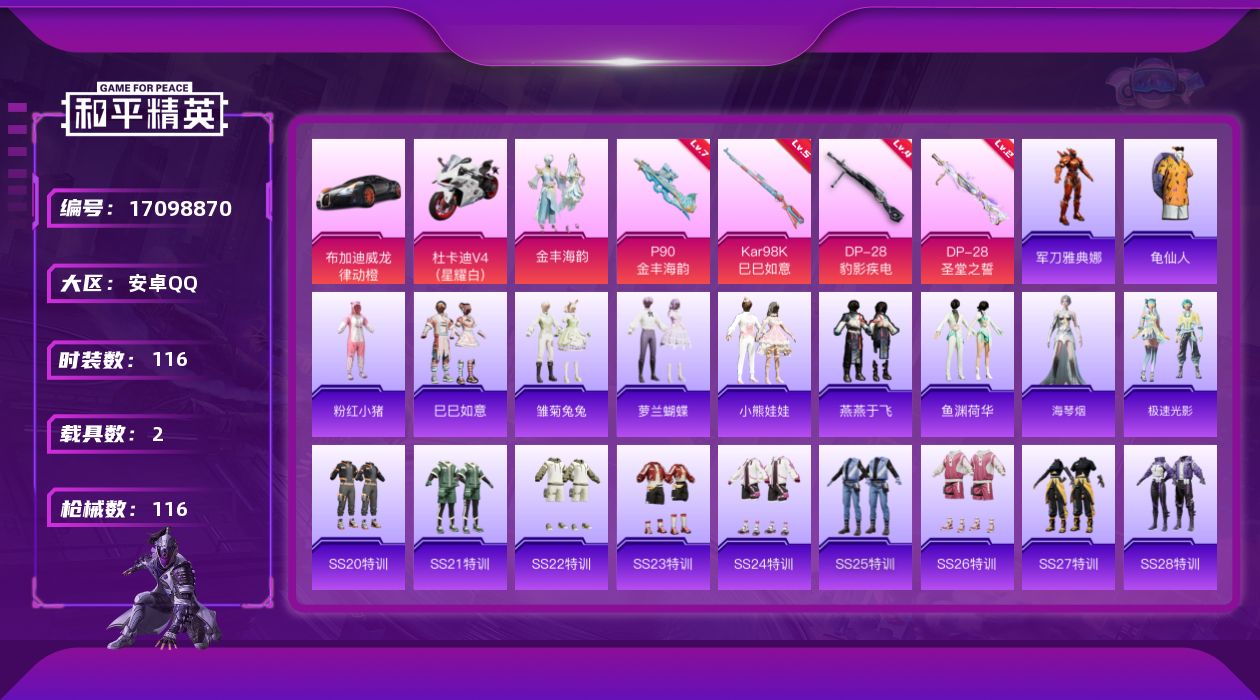 [17098870]【1368】安卓 手Q-1粉装-4特效枪-2载具-1粉色飞行器-38695热力值-9王牌印记-116套装-116枪皮 【热门品类】:角色-军刀雅典娜,套装-龟仙人,套装-粉红小猪 【粉色载具】:布加迪威龙(律动橙),杜卡迪 Panigale V4(星耀白) 【粉色套装】:粉装-金丰海韵 【粉色枪皮等级】:P90-金丰海韵(七级),Kar98K-巳巳如意(五级),DP-28-圣堂之誓(二级),DP-28-豹影疾电(四级) 【粉色枪皮】:P90-金丰海韵,Kar98K-巳巳如意,DP-28-圣堂之誓,DP-28-豹影疾电 【粉色飞行器】:BEARBRICK飞行器 【粉色降落伞】:金丰海韵降落伞,月影灵韵降落伞,喜羊羊与灰太狼降落伞 【稀有套装】:套装-龟仙人,套装-巳巳如意,套装-雏菊兔兔,套装-萝兰蝴蝶,套装-小熊娃娃,套装-燕燕于飞,套装-鱼渊荷华,角色-海琴烟,套装-极速光影 【稀有枪皮】:AKM-彩虹符号,AKM-环太平洋,AKM-破晓战魂,AKM-龙的传人,M16A4-幻世战舞者,SCAR-L-炫彩节奏,SCAR-L-玉兔迎春,M416-糯团青竹,M416-红色方程式,GROZA-彩虹符号,AUG-耀粉歌者,QBZ-彩虹符号,M762-彩虹符号,AC-VAL-天降萌叽,AC-VAL-快闪甜心,蜜獾-垂柳戏鸭,蜜獾-天降萌叽,UZI-啾咪啾咪,UZI-天降萌叽,UZI-红色方程式,UZI-月影灵韵,UMP45-涂山之恋,UMP45-炫光之旅,Vector-焰鹰斗篷,Vector-彩虹符号,汤姆逊-天降萌叽,汤姆逊-环太平洋,汤姆逊-耀粉歌者,P90-快闪甜心,P90-巳巳如意,Kar98K-红色方程式,M24-炫彩节奏,AWM-焰鹰斗篷,SKS-糯团青竹,VSS-彩虹符号,SLR-彩虹符号,AMR-喜羊羊与灰太狼,MK20-H-快闪甜心,S686-彩虹符号,S686-红色方程式,S686-巳巳如意,S1897-炫彩节奏,S12K-玩趣呆呆,S12K-破晓战魂,S12K-幻世战舞者,DBS-焰鹰斗篷,DBS-彩虹符号,DBS-月影灵韵,M249-彩虹符号,M249-破晓战魂,DP-28-焰鹰斗篷,DP-28-彩虹符号,DP-28-玉鳞金羽,MG3-幻世战舞者,P1911-小狗蛇点点,沙漠之鹰-快闪甜心,爆炸猎弓-喜羊羊与灰太狼,破片手榴弹-巳巳如意 【其他套装】