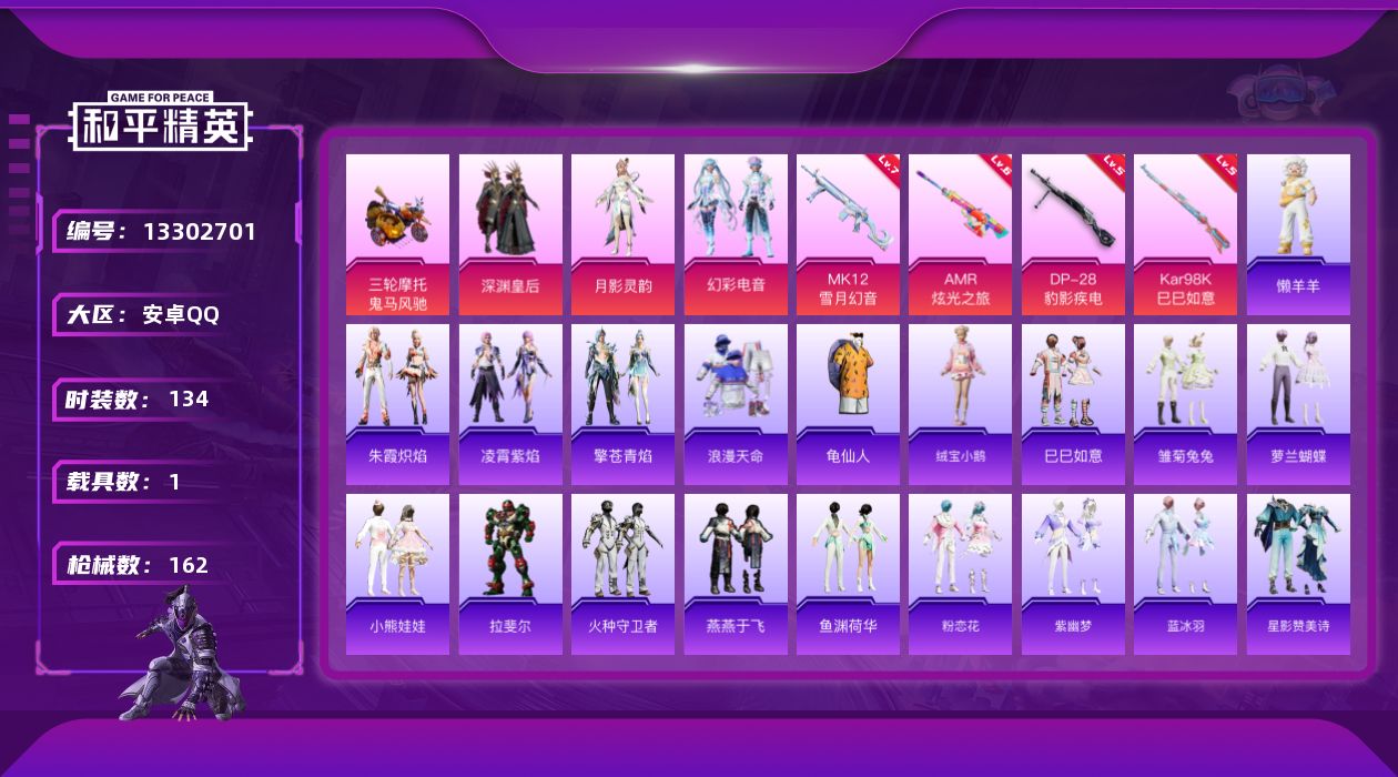 [13302701]【1434】安卓 手Q-3粉装-4特效枪-1载具-0粉色飞行器-48566热力值-7王牌印记-134套装-162枪皮 【热门品类】:套装-浪漫天命,套装-龟仙人 【粉色载具】:鬼马风驰 【粉色套装】:粉装-深渊皇后,角色-月影灵韵,粉装-幻彩电音 【粉色枪皮等级】:Kar98K-巳巳如意(五级),AMR-炫光之旅(六级),MK12-雪月幻音(七级),DP-28-豹影疾电(五级) 【粉色枪皮】:Kar98K-巳巳如意,AMR-炫光之旅,MK12-雪月幻音,DP-28-豹影疾电 【粉色降落伞】:百合蜜语降落伞,彩虹甜喵降落伞,第五大道降落伞,闲梦青缨降落伞,圣堂之誓降落伞,精灵梦叶罗丽降落伞,创世·救赎降落伞,守护天翼降落伞,金丰海韵降落伞,拳皇·狂花道降落伞,鬼刀降落伞,桃粉嫣然降落伞,戏水时光降落伞,雪月幻音降落伞,喜羊羊与灰太狼降落伞 【稀有套装】:套装-龟仙人,套装-绒宝小鹅,套装-巳巳如意,套装-雏菊兔兔,套装-萝兰蝴蝶,套装-小熊娃娃,角色-拉斐尔,套装-火种守卫者,套装-燕燕于飞,套装-鱼渊荷华,套装-粉恋花,套装-紫幽梦,套装-蓝冰羽,套装-星影赞美诗,角色-夜瞳黯灵,套装-朱霞炽焰,套装-凌霄紫焰,套装-擎苍青焰,玩偶服-懒羊羊 【稀有枪皮】:AKM-影袭,AKM-龙的传人,M16A4-天使羽翼,M16A4-莲影清波,M416-糯团青竹,GROZA-懵萌河马,AUG-天降萌叽,AUG-耀粉歌者,AUG-闲梦青缨,AUG-月影灵韵,QBZ-彩虹符号,M762-天星战神,M762-彩虹符号,G36C-懵萌河马,AC-VAL-快闪甜心,AC-VAL-闲梦青缨,蜜獾-天降萌叽,ARX-凌霄紫焰,UZI-啾咪啾咪,UMP45-涂山之恋,Vector-焰鹰斗篷,Vector-生命誓言,汤姆逊-天降萌叽,汤姆逊-炫彩节奏,野牛-粉锦千层,MP5K-彩虹嘻嘻猴,AKS-74U-鬼刀,JS9-凌霄紫焰,P90-快闪甜心,P90-巳巳如意,Kar98K-彩虹符号,Kar98K-星穹咏叹调,AWM-焰鹰斗篷,AWM-恐龙拽拽,SKS-炫彩节奏,Mini14-涂山之恋,Mini14-穿刺龙虾,莫辛纳甘-懵萌河马,AMR-喜羊羊与灰太狼,M417-惊鸿侠骨,MK20-H-快闪甜心,M200-惊鸿侠骨,S686-奇异狩猎者,S686-彩虹符号,S686-生命誓言,S686-巳巳