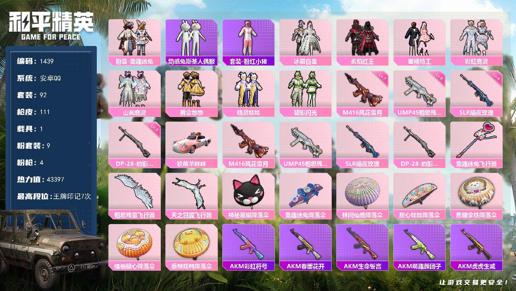 [17368109]【1439】安卓 手Q-9粉装-4特效枪-1载具-3粉色飞行器-43397热力值-7王牌印记-92套装-111枪皮