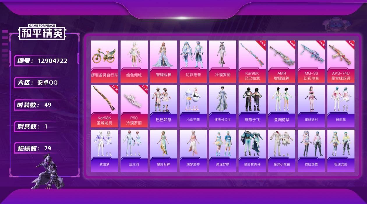 [12904722]【1452】安卓 手Q-4粉装-6特效枪-1载具-3粉色飞行器-24848热力值-2王牌印记-49套装-79枪皮 【粉色载具】:辉羽雀灵自行车 【粉色套装】:角色-绝色倾城,角色-智耀战神,粉装-幻彩电音,角色-冷漠罗丽 【粉色枪皮等级】:AKS-74U-星穹咏叹调(四级),P90-冷漠罗丽(二级),Kar98K-巳巳如意(五级),Kar98K-圣域龙灵(三级),AMR-智耀战神(五级),MG-36-幻彩电音(五级) 【粉色枪皮】:AKS-74U-星穹咏叹调,P90-冷漠罗丽,Kar98K-巳巳如意,Kar98K-圣域龙灵,AMR-智耀战神,MG-36-幻彩电音 【粉色飞行器】:绝色倾城飞行器,圣域金龙飞行器,雀灵庇佑飞行器 【粉色降落伞】:绝色倾城降落伞,樱桃泡泡降落伞,圣域龙灵降落伞,智耀战神降落伞,星穹咏叹调降落伞,幻星舰长降落伞,幻彩电音降落伞,冷漠罗丽降落伞 【稀有套装】:套装-巳巳如意,套装-小鸟芋圆,角色-怀庆长公主,套装-燕燕于飞,套装-鱼渊荷华,角色-蜜桃派对,套装-粉恋花,套装-紫幽梦,套装-蓝冰羽,角色-猎影月神,角色-瑰梦爱神,套装-果冻柠檬,套装-星影赞美诗,套装-星渊小夜曲,套装-霓虹热舞,套装-极速光影,套装-彩虹兔,套装-云朵鹅,套装-雪绒豹,角色-时希公主,角色-灵公主,角色-乐音,套装-蓝海鲸歌 【稀有枪皮】:SCAR-L-炫彩节奏,SCAR-L-玉兔迎春,SCAR-L-冷漠罗丽,M416-萌萌史莱姆,GROZA-荧海星豚,M762-彩虹符号,M762-萌物绒绒,M762-云朵鹅,G36C-星穹咏叹调,蜜獾-青瓷战姬,UMP45-绒宝小鹅,汤姆逊-智耀战神,AKS-74U-辉羽雀灵,P90-巳巳如意,Kar98K-星穹咏叹调,M24-幻彩电音,SKS-圣域龙灵,Mini14-黄金龙骨,Mini14-辉羽雀灵,AMR-镜光幻境,MK20-H-樱桃泡泡,MK20-H-圣域龙灵,SVD-云朵鹅,SVD-冷漠罗丽,S686-雪月幻音,S686-巳巳如意,S12K-智耀战神,DBS-幻彩电音,SPAS-12-云朵鹅,M249-糯团青竹,DP-28-彩虹符号,DP-28-齐天大圣,MG3-青瓷战姬,MG3-智耀战神,R45-幻彩电音,短管霰弹-竹节火铳,短管霰弹-圣域龙灵,短管霰弹-星穹咏叹调,沙漠之鹰-云朵鹅,爆炸猎弓-雪月幻音,大砍刀-