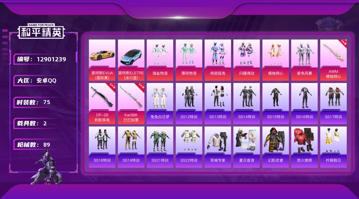 [12901239]【1446】安卓 手Q-6粉装-3特效枪-2载具-1粉色飞行器-33020热力值-1王牌印记-75套装-89枪皮 【粉色载具】:路特斯EVIJA(星际黄),路特斯ELETRE(冰川蓝) 【粉色套装】:粉装-海盐物语,粉装-薄荷物语,粉装-绚丽摇曳,粉装-闪耀律动,粉装-橘柚倾心,粉装-紫电风暴 【粉色枪皮等级】:Kar98K-巳巳如意(五级),AWM-橘柚倾心(六级),DP-28-豹影疾电(五级) 【粉色枪皮】:Kar98K-巳巳如意,AWM-橘柚倾心,DP-28-豹影疾电 【粉色飞行器】:青春物语飞行器 【粉色降落伞】:幻梦音符降落伞,橘柚倾心降落伞,筑梦精灵降落伞,桃粉嫣然降落伞,星穹咏叹调降落伞 【稀有枪皮】:AKM-四圣焕新,AKM-夜灯,AKM-彩虹符号,AKM-灼热熔岩,AKM-百万伏特,AKM-筑梦精灵,AKM-萌趣颜团子,M16A4-幻世战舞者,M16A4-红色方程式,M16A4-蓝色火焰,SCAR-L-兔兔白日梦,SCAR-L-炫彩节奏,SCAR-L-玉兔迎春,SCAR-L-红色方程式,M416-紫翼圣骑,M416-红色方程式,M416-蓝色火焰,GROZA-彩虹符号,GROZA-紫翼圣骑,AUG-幻梦音符,AUG-耀粉歌者,QBZ-原初圣火,QBZ-飞驰魅影,M762-橘柚倾心,M762-牛气冲天,G36C-冷魅冰骑,G36C-暗夜玫瑰,AC-VAL-天降萌叽,UZI-红色方程式,UMP45-蓝色火焰,Vector-彩虹符号,汤姆逊-天降萌叽,汤姆逊-耀粉歌者,P90-筑梦精灵,P90-飞驰魅影,Kar98K-彩虹符号,Kar98K-红色方程式,Kar98K-飞驰魅影,Kar98K-星穹咏叹调,M24-奇异狩猎者,SKS-幻梦音符,SKS-炫彩节奏,Mini14-原初圣火,Mini14-炫彩节奏,Mini14-筑梦精灵,S686-橘柚倾心,S686-红色方程式,S1897-飞驰魅影,S12K-玩趣呆呆,S12K-破晓战魂,M249-冷魅冰骑,M249-四圣焕新,M249-彩虹符号,DP-28-原初圣火,DP-28-彩虹符号,DP-28-橘柚倾心,DP-28-紫翼圣骑,MG3-幻世战舞者,MG3-青春物语,P18C-原初圣火 【其他套装】:套装-SS12特训,套装-SS13特训,套装-SS14特训,套装-SS15特训,套装-SS16特训,套装-S