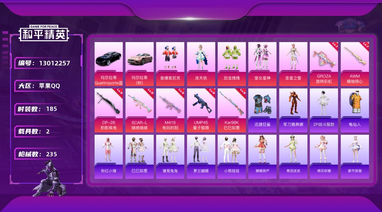 [13012257]【1473】苹果 手Q-5粉装-7特效枪-2载具-0粉色飞行器-82705热力值-9王牌印记-185套装-235枪皮 【热门品类】:粉装-音爆索尼克,角色-军刀雅典娜,角色-2P战斗服款,套装-龟仙人,套装-粉红小猪 【粉色载具】:玛莎拉蒂Quattroporte(夜幕蓝),玛莎拉蒂Ghibli(粉),僚机-萌兔起飞 【粉色套装】:角色-洛天依,粉装-恐龙拽拽,粉装-音爆索尼克,粉装-室女星神,角色-圣堂之誓 【粉色枪皮等级】:SCAR-L-锦绣绵绵(五级),M416-电玩时刻(五级),GROZA-旋转彩虹(七级),UMP45-量子极限(五级),Kar98K-巳巳如意(五级),AWM-橘柚倾心(七级),DP-28-豹影疾电(五级) 【粉色枪皮】:SCAR-L-锦绣绵绵,M416-电玩时刻,GROZA-旋转彩虹,UMP45-量子极限,Kar98K-巳巳如意,AWM-橘柚倾心,DP-28-豹影疾电 【粉色降落伞】:炫紫旋律降落伞,烈焰拳霸降落伞,齐天大圣降落伞,洛神天依降落伞,暗星紫秘降落伞,青春物语降落伞,恐龙拽拽降落伞,垂柳戏鸭降落伞,千面幻镜降落伞,旋转彩虹降落伞,海螺星光降落伞,音爆索尼克降落伞,黄族统领降落伞,未来歌姬降落伞,猪猪侠降落伞,拳皇·狂花道降落伞 【稀有套装】:套装-龟仙人,套装-巳巳如意,套装-雏菊兔兔,套装-萝兰蝴蝶,套装-小熊娃娃,套装-糖糖葫芦,套装-青团波波,套装-棉花软糖,角色-都市丽猫,角色-摩登魅猫 【稀有枪皮】:AKM-2P战斗服款,AKM-夜灯,AKM-彩虹符号,AKM-星之彼岸,AKM-破晓战魂,AKM-萌趣颜团子,AKM-虎虎生威,AKM-霓虹街区,AKM-龙的传人,M16A4-幻世战舞者,M16A4-甜心亚梦,M16A4-生命誓言,M16A4-莲影清波,M16A4-千金淑猫,SCAR-L-暗夜玫瑰,SCAR-L-炫彩节奏,SCAR-L-玉兔迎春,SCAR-L-红色方程式,M416-糯团青竹,M416-红色方程式,M416-蓝色火焰,GROZA-异彩先驱,GROZA-彩虹符号,GROZA-懵萌河马,GROZA-梨园星光,GROZA-治愈之星,GROZA-田园牧歌,AUG-2P战斗服款,AUG-天降萌叽,AUG-耀粉歌者,AUG-青春冒险家,QBZ-彩虹符号,QBZ-未来歌姬,QBZ-洛神天依,QBZ-飞驰魅影,M762-天