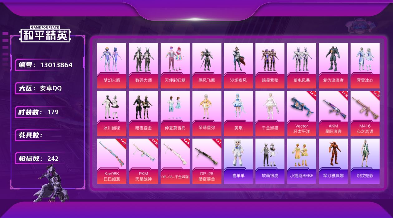 [13013864]【1479】安卓 手Q-15粉装-7特效枪-0载具-4粉色飞行器-82835热力值-8王牌印记-179套装-242枪皮 【热门品类】:粉装-梦幻火箭,角色-军刀雅典娜,小恶魔头饰 【粉色套装】:粉装-数码大师,粉装-天使彩虹糖,粉装-梦幻火箭,粉装-飓风飞鹰,粉装-沙场疾风,粉装-暗星紫秘,粉装-紫电风暴,角色-复仇流浪者,粉装-霁雪冰心,粉装-冰川幽秘,粉装-暗夜鎏金,粉装-仲夏莫吉托,角色-呆萌星弥,角色-美琪,角色-千金淑猫 【粉色枪皮等级】:AKM-星际浪客(五级),M416-心之恋语(五级),Vector-环太平洋(七级),Kar98K-巳巳如意(五级),DP-28-暗夜鎏金(一级),DP-28-千金淑猫(四级),PKM-天星战神(五级) 【粉色枪皮】:AKM-星际浪客,M416-心之恋语,Vector-环太平洋,Kar98K-巳巳如意,DP-28-暗夜鎏金,DP-28-千金淑猫,PKM-天星战神 【粉色飞行器】:梦幻火箭飞行器,齐天大圣飞行器,纯梦嫁纱飞行翼,黄族统领飞行器 【粉色降落伞】:深海曼妙降落伞,甜心宝贝降落伞,至尊龙雀降落伞,春暖花开降落伞,梦幻火箭降落伞,心之恋语降落伞,齐天大圣降落伞,洛神天依降落伞,绚金瑰梦降落伞,恐龙拽拽降落伞,环太平洋降落伞,垂柳戏鸭降落伞,翩跹演武降落伞,太空嘟嘟降落伞,彩虹甜喵降落伞,旋转彩虹降落伞,星际浪客降落伞,青空秋雨降落伞,歌者泠鸢降落伞,暗夜鎏金降落伞,雪梅暗香降落伞,纯梦嫁纱降落伞,仲夏莫吉托降落伞,龙珠超降落伞,飒粉甜心降落伞,未来歌姬降落伞,闲梦青缨降落伞,江南烟雨降落伞,冠军兔兔降落伞,创世·救赎降落伞,未来领航者降落伞,千金淑猫降落伞,绯穹魔姬降落伞 【稀有套装】:套装-炽纹蛇影,套装-巳巳如意,套装-糖糖葫芦,套装-青团波波,角色-都市丽猫,套装-云朵鹅,套装-雪绒豹,玩偶服-喜羊羊 【稀有枪皮】:AKM-夜灯,AKM-彩虹符号,AKM-星之信仰,AKM-灼热熔岩,AKM-王牌投手,AKM-环太平洋,AKM-生命誓言,AKM-破晓战魂,AKM-缤纷海域,AKM-萌趣颜团子,AKM-虎虎生威,AKM-霓虹街区,M16A4-幻世战舞者,M16A4-甜心亚梦,M16A4-红色方程式,M16A4-千金淑猫,SCAR-L-炫彩节奏,SCAR-L-玉兔迎春,SCAR-L-生命誓言,SCAR-L-青丘仙
