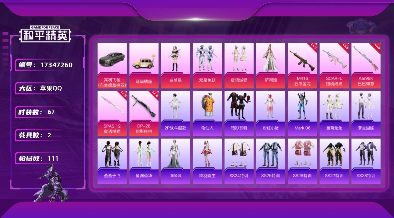 [17347260]【1493】苹果 手Q-4粉装-5特效枪-2载具-0粉色飞行器-37366热力值-3王牌印记-67套装-111枪皮 【热门品类】:角色-2P战斗服款,套装-龟仙人,套装-暗影哥特,套装-粉红小猪,角色-Mark.06 【粉色载具】:宾利飞驰(布罗德盖棕双色),萌喵橘座,僚机-萌兔起飞 【粉色套装】:角色-白兰星,粉装-双星鱼跃,粉装-蜜语绒猫,角色-萨利娅 【粉色枪皮等级】:SCAR-L-锦绣绵绵(五级),M416-五爪金龙(七级),Kar98K-巳巳如意(五级),SPAS-12-蜜语绒猫(五级),DP-28-豹影疾电(四级) 【粉色枪皮】:SCAR-L-锦绣绵绵,M416-五爪金龙,Kar98K-巳巳如意,SPAS-12-蜜语绒猫,DP-28-豹影疾电 【粉色降落伞】:心之恋语降落伞,风花雪月降落伞,太空嘟嘟降落伞,变形金刚降落伞,萌物绒绒降落伞,莲影清波降落伞,龙行天下降落伞,蜜语绒猫降落伞,鎏金朋克降落伞,创世·救赎降落伞,忍者神龟降落伞 【稀有套装】:套装-龟仙人,套装-雏菊兔兔,套装-萝兰蝴蝶,套装-燕燕于飞,套装-鱼渊荷华,角色-海琴烟,角色-绛羽幽主 【稀有枪皮】:AKM-龙的传人,SCAR-L-炫彩节奏,SCAR-L-红色方程式,M416-糯团青竹,M416-蓝色火焰,GROZA-恐龙拽拽,GROZA-懵萌河马,AUG-天降萌叽,AUG-耀粉歌者,QBZ-彩虹符号,M762-奇异狩猎者,M762-牛气冲天,M762-萌物绒绒,M762-诡娃娃,G36C-懵萌河马,AC-VAL-快闪甜心,蜜獾-天降萌叽,UZI-啾咪啾咪,UZI-天降萌叽,UMP45-绒宝小鹅,Vector-焰鹰斗篷,汤姆逊-天降萌叽,AKS-74U-鬼刀,P90-快闪甜心,P90-巳巳如意,AWM-焰鹰斗篷,AWM-超新星,SKS-心之恋语,VSS-彩虹符号,莫辛纳甘-懵萌河马,莫辛纳甘-蜜语绒猫,M417-惊鸿侠骨,MK20-H-快闪甜心,MK20-H-莲影清波,M200-惊鸿侠骨,M200-酷泡奶龙,S686-蜜语绒猫,S12K-玩趣呆呆,DBS-焰鹰斗篷,DBS-无垠阁,AA12-G-炫光之旅,M249-彩虹符号,DP-28-焰鹰斗篷,DP-28-甜蜜旋律,MG3-幻世战舞者,MG3-惊鸿侠骨,PKM-蜜语绒猫,PKM-懵萌河马,沙漠之鹰-快闪甜心,爆炸猎弓-惊鸿侠骨 【其他