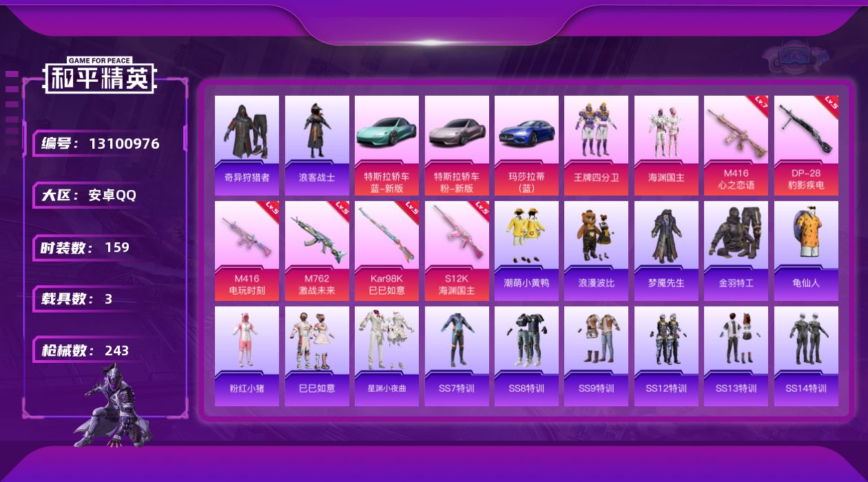 [13100976]【1499】安卓 手Q-2粉装-6特效枪-3载具-1粉色飞行器-77583热力值-6王牌印记-159套装-243枪皮 【热门品类】:套装-奇异狩猎者,套装-金羽特工,套装-浪客战士,套装-龟仙人,套装-潮萌小黄鸭,套装-浪漫波比,套装-粉红小猪 【粉色载具】:特斯拉Roadster(水滴蓝),特斯拉Roadster(沁心粉),玛莎拉蒂Ghibli(蓝),空客H135-蔚蓝之翼 【粉色套装】:粉装-王牌四分卫,粉装-海渊国主 【粉色枪皮等级】:M416-心之恋语(七级),M416-电玩时刻(五级),M762-激战未来(五级),Kar98K-巳巳如意(五级),S12K-海渊国主(五级),DP-28-豹影疾电(五级) 【粉色枪皮】:M416-心之恋语,M416-电玩时刻,M762-激战未来,Kar98K-巳巳如意,S12K-海渊国主,DP-28-豹影疾电 【粉色飞行器】:梦幻火箭飞行器 【粉色降落伞】:梦幻火箭降落伞,四圣焕新降落伞,锦绣火鲤降落伞,王牌四分卫降落伞,怪笑疯兔降落伞,海渊国主降落伞,拂晓神骑降落伞 【稀有套装】:套装-龟仙人,套装-巳巳如意,套装-星渊小夜曲 【稀有枪皮】:AKM-夜灯,AKM-彩虹符号,AKM-海渊国主,AKM-灼热熔岩,AKM-玉龙,AKM-生命誓言,AKM-百万伏特,AKM-破晓战魂,AKM-萌趣颜团子,AKM-虎虎生威,AKM-霓虹街区,AKM-龙的传人,M16A4-夜灯,M16A4-幻世战舞者,M16A4-红色方程式,M16A4-蓝色火焰,SCAR-L-浪客战士,SCAR-L-炫彩节奏,SCAR-L-玉兔迎春,SCAR-L-红色方程式,SCAR-L-龙宫之主,M416-夜灯,M416-神秘黑猫,M416-糯团青竹,M416-红色方程式,M416-蓝色火焰,GROZA-异彩先驱,GROZA-彩虹符号,GROZA-恐龙拽拽,GROZA-治愈之星,GROZA-生命誓言,AUG-天降萌叽,AUG-焰龙焚天,AUG-耀粉歌者,AUG-青春冒险家,QBZ-原初圣火,QBZ-彩虹符号,QBZ-电玩视界,QBZ-神秘黑猫,QBZ-飞驰魅影,M762-天降萌叽,M762-奇异狩猎者,M762-牛气冲天,M762-瑞龙福将,M762-镭射皇者,Mk47-妙红点点,Mk47-青春冒险家,G36C-不夜海上花,G36C-时空追击者,AC-VAL-天降萌