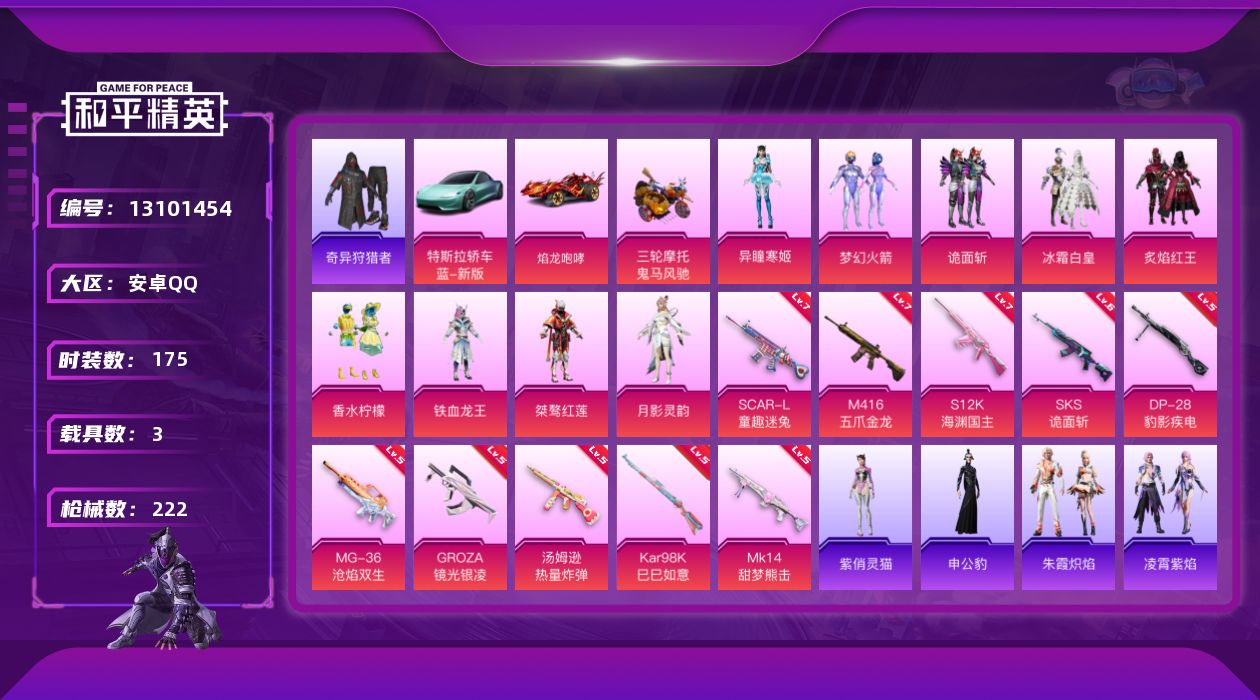 - PX_2077578- 安卓手Q-7王牌印记-1粉装-1特效枪-1载具-49670热力值-146套装-174枪皮-1卓越印记-0传奇印记 【1粉装】,星穹咏叹调 【1特效枪】Kar98K-巳巳如意-5级 【2稀有紫装】,暗影哥特,龟仙人, 【1稀有载具】,兰博基尼Estoque(银翼灰), 【146稀有时装】,SS31特训,SS33特训,SS32特训,蓝冰羽,极速光影,雪绒豹,紫幽梦,大橘大利,