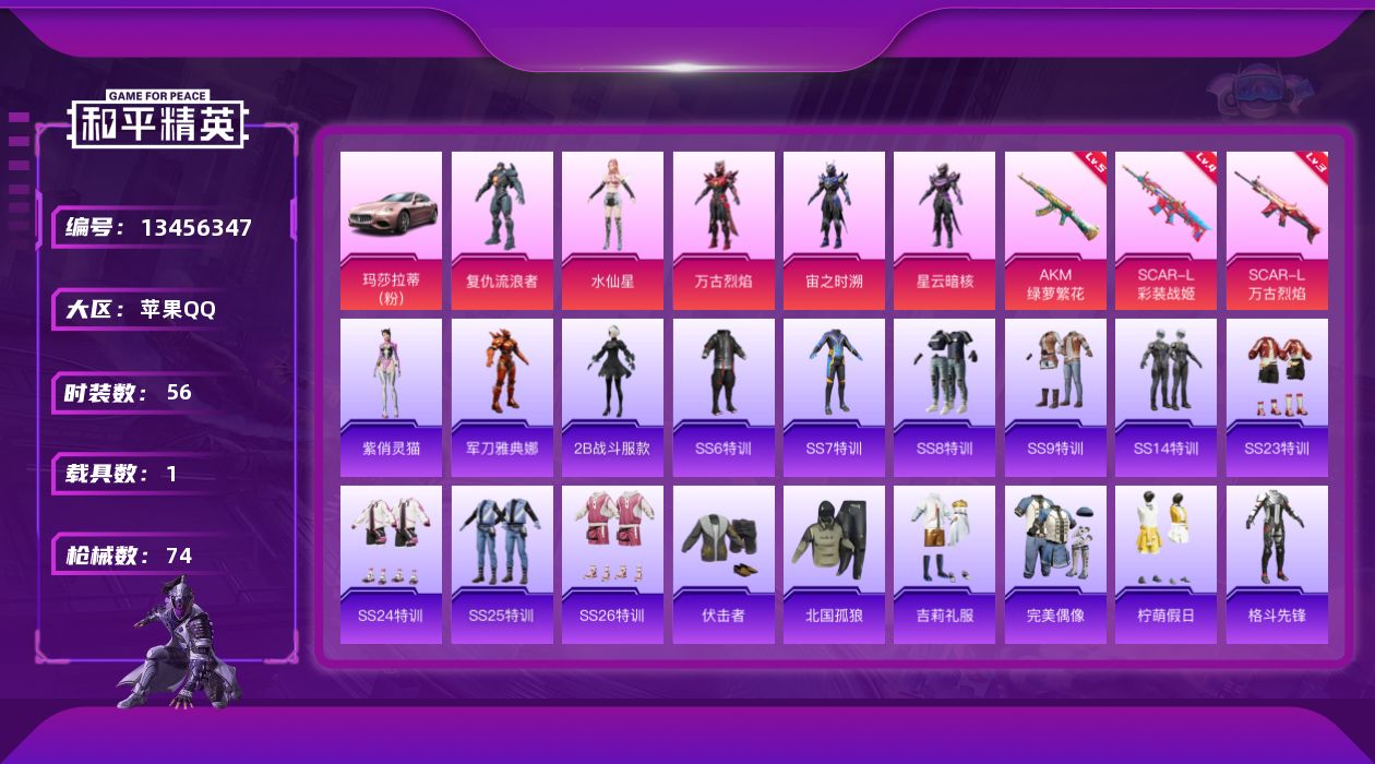 [13456347]【1523】苹果 手Q-5粉装-3特效枪-1载具-1粉色飞行器-23461热力值-3王牌印记-56套装-74枪皮