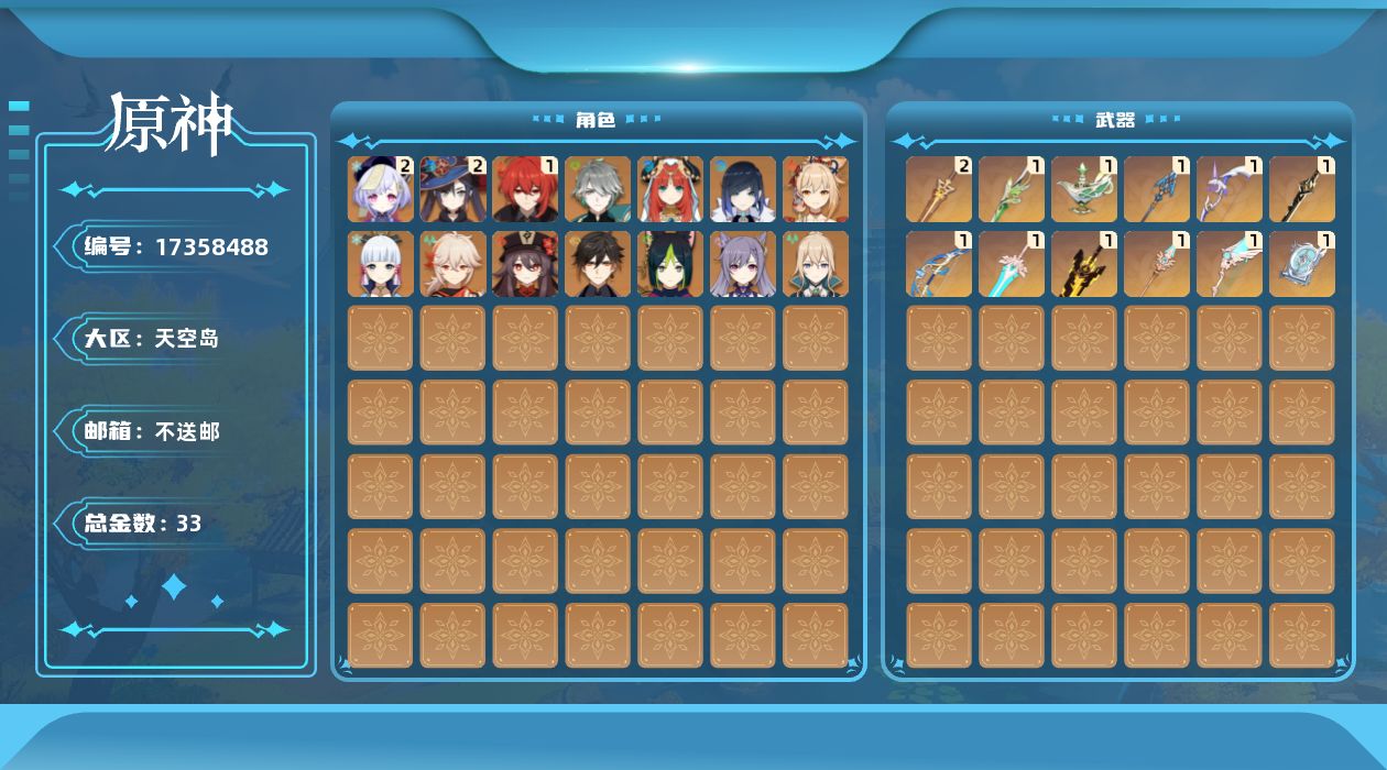 0命艾尔海森,0命妮露,0命提纳里,0命夜兰,0命枫原万叶,0命神里绫华,0命钟离,0命胡桃,0命宵宫,0命刻晴,2命七七,0命琴,2命莫娜,1命迪卢克,精1裁叶萃光,精1千夜浮梦,精2圣显之钥,精1息灾,精1终末嗟叹之诗,精1无工之剑,精1四风原典,精1天空之脊,精1天空之翼,精1阿莫斯之弓,精1斫峰之刃,精1天空之傲
