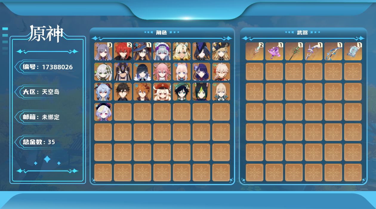 0命克洛琳德,0命娜维娅,0命纳西妲,0命赛诺,0命提纳里,0命夜兰,0命八重神子,0命雷电将军,0命枫原万叶,0命钟离,0命甘雨,0命温迪,0命可莉,0命达达利亚,0命珊瑚宫心海,3命刻晴,0命七七,0命琴,1命莫娜,2命迪卢克,0命希诺宁,0命梦见月瑞希,精1神乐之真意,精1终末嗟叹之诗,精1四风原典,精1和璞鸢,精2天空之脊,精1阿莫斯之弓