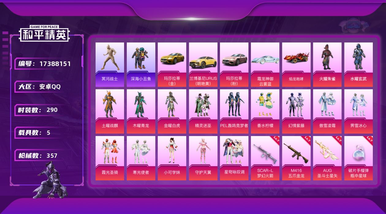 [17388151]安卓 手Q-16粉装-7特效枪-5载具-3粉色飞行器-121741热力值-21王牌印记-290套装-357枪皮【热门品类】:套装-冥河战士,套装-深海小丑鱼,套装-小丑鱼,套装-金羽特工,旭日初心兜帽大衣,套装-龟仙人,套装-潮萌小黄鸭,套装-浪漫波比,套装-粉红小猪,角色-Mark.06,M416-星际漫游,熔岩游骑兵连帽夹克【粉色套装】:粉装-火曜朱雀,粉装-水曜玄武,粉装-土曜战麒,粉装-木曜青龙,粉装-金曜白虎,粉装-精灵迷巫,粉装-PEL轰鸣竞梦者,粉装-香水柠檬,粉装-幻情紫藤,粉装-傲雪凌霜,粉装-霁雪冰心,粉装-霞光圣骑,粉装-寒光使者,角色-小可学妹,角色-守护天翼,粉装-星穹咏叹调【粉色枪皮等级】:SCAR-L-梦幻火箭(七级),M416-五爪金龙(七级),GROZA-镜光银凌(五级),AUG-圣斗士星矢(七级),Kar98K-巳巳如意(五级),DP-28-豹影疾电(五级),破片手榴弹-瓶中星球(七级)【粉色载具】:兰博基尼URUS(明艳黄),玛莎拉蒂Ghibli(金),玛莎拉蒂Ghibli(粉),霜龙神御(云雾蓝),焰龙咆哮,空客H135-蔚蓝之翼【粉色枪皮】:SCAR-L-梦幻火箭,M416-五爪金龙,GROZA-镜光银凌,AUG-圣斗士星矢,Kar98K-巳巳如意,DP-28-豹影疾电,破片手榴弹-瓶中星球【粉色飞行器】:梦幻火箭飞行器,镜光幻境飞行翼