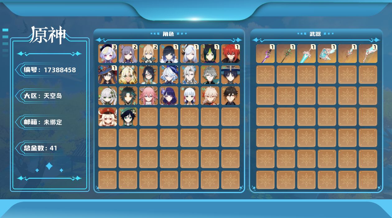 0命闲云,0命芙宁娜,0命那维莱特,0命艾尔海森,0命流浪者,0命纳西妲,1命提纳里,1命夜兰,0命八重神子,1命申鹤,0命雷电将军,0命枫原万叶,0命神里绫华,0命钟离,0命魈,0命温迪,0命可莉,2命刻晴,3命七七,2命琴,1命莫娜,1命迪卢克,0命希诺宁,精1雾切之回光,精1和璞鸢,精1天空之脊,精1天空之翼,精1天空之卷,精1天空之傲