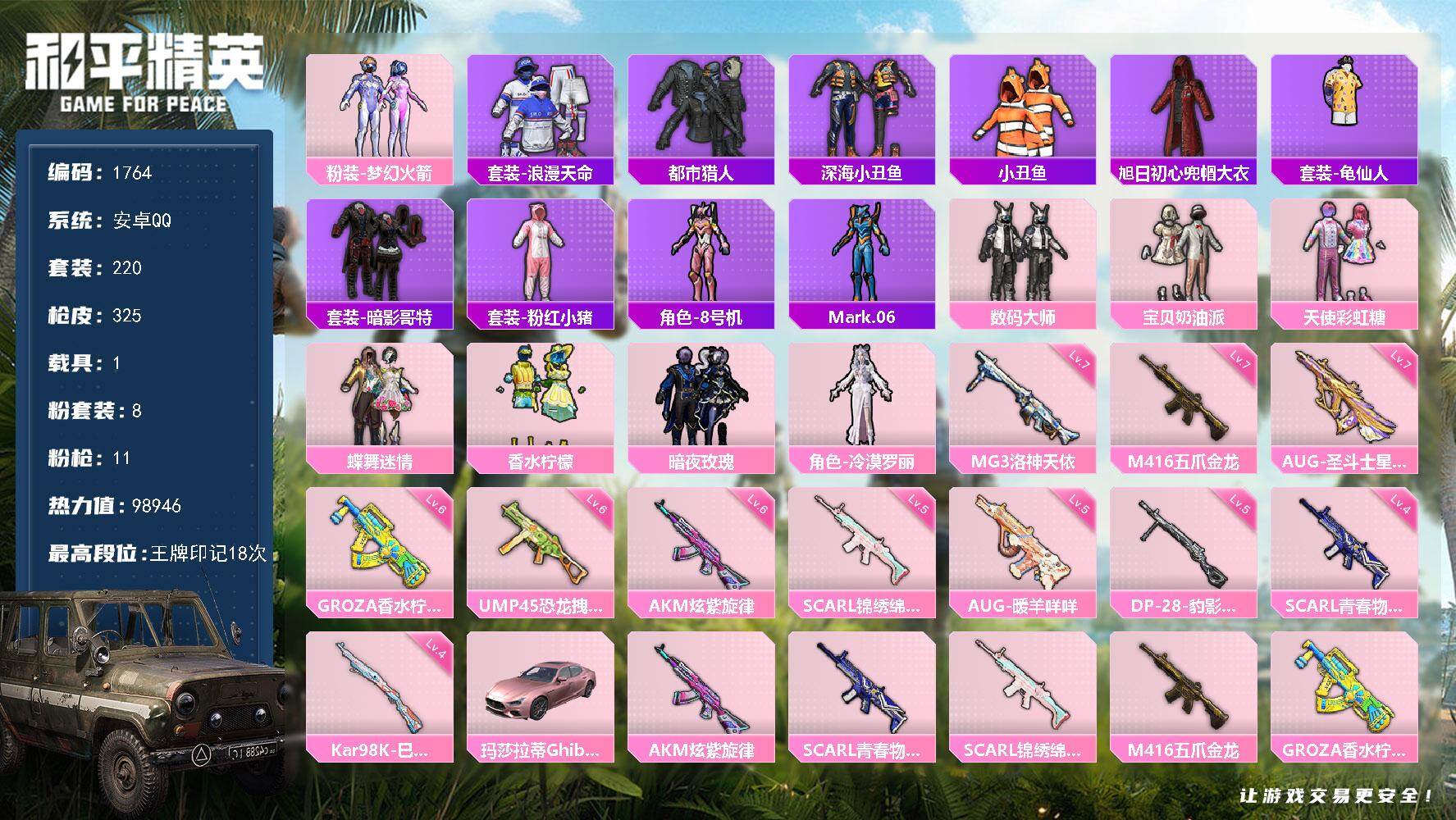 [17392213]【1764】安卓 手Q-8粉装-11特效枪-1载具-0粉色飞行器-98946热力值-18王牌印记-220套装-325枪皮