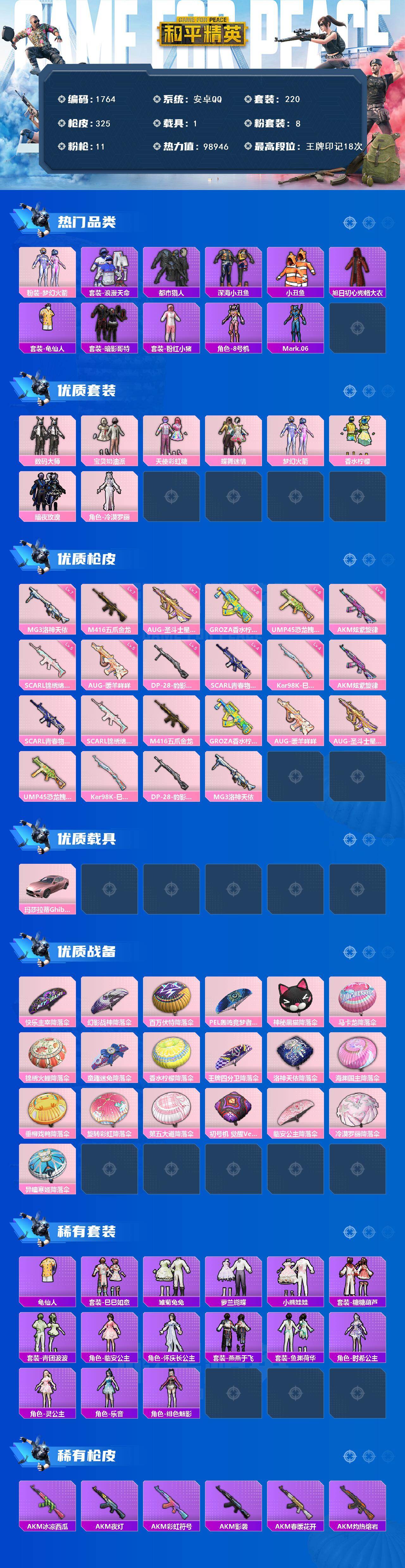[17392213]【1764】安卓 手Q-8粉装-11特效枪-1载具-0粉色飞行器-98946热力值-18王牌印记-220套装-325枪皮 【热门品类】:粉装-梦幻火箭,套装-浪漫天命,套装-都市猎人,套装-深海小丑鱼,套装-小丑鱼,旭日初心兜帽大衣,套装-龟仙人,套装-暗影哥特,套装-粉红小猪,角色-8号机,角色-Mark.06 【粉色套装】:粉装-数码大师,粉装-宝贝奶油派,粉装-天使彩虹糖,粉装-蝶舞迷情,粉装-梦幻火箭,粉装-香水柠檬,粉装-暗夜玫瑰,角色-冷漠罗丽 【粉色枪皮等级】:AKM-炫紫旋律(六级),SCAR-L-青春物语(四级),SCAR-L-锦绣绵绵(五级),M416-五爪金龙(七级),GROZA-香水柠檬(六级),AUG-暖羊咩咩(五级),AUG-圣斗士星矢(七级),UMP45-恐龙拽拽(六级),Kar98K-巳巳如意(四级),DP-28-豹影疾电(五级),MG3-洛神天依(七级) 【粉色载具】:玛莎拉蒂Ghibli(粉) 【粉色枪皮】:AKM-炫紫旋律,SCAR-L-青春物语,SCAR-L-锦绣绵绵,M416-五爪金龙,GROZA-香水柠檬,AUG-暖羊咩咩,AUG-圣斗士星矢,UMP45-恐龙拽拽,Kar98K-巳巳如意,DP-28-豹影疾电,MG3-洛神天依 【粉色降落伞】:快乐主宰降落伞,幻影战神降落伞,百万伏特降落伞,PEL轰鸣竞梦者降落伞,神秘黑猫降落伞,马卡龙降落伞,锦绣火鲤降落伞,童趣迷兔降落伞,香水柠檬降落伞,王牌四分卫降落伞,洛神天依降落伞,海渊国主降落伞,垂柳戏鸭降落伞,旋转彩虹降落伞,第五大道降落伞,初号机 觉醒Ver.降落伞,临安公主降落伞,冷漠罗丽降落伞,异瞳寒姬降落伞 【稀有套装】:套装-龟仙人,套装-巳巳如意,套装-雏菊兔兔,套装-萝兰蝴蝶,套装-小熊娃娃,套装-糖糖葫芦,套装-青团波波,角色-临安公主,角色-怀庆长公主,套装-燕燕于飞,套装-鱼渊荷华,角色-时希公主,角色-灵公主,角色-乐音,角色-绯色魅影 【稀有枪皮】:AKM-冰凉西瓜,AKM-夜灯,AKM-彩虹符号,AKM-影袭,AKM-春暖花开,AKM-灼热熔岩,AKM-玉龙,AKM-百万伏特,AKM-破晓战魂,AKM-缤纷海域,AKM-萌趣颜团子,AKM-虎虎生威,AKM-霓虹街区,AKM-龙的传人,M16A4-夜灯,M16A4-幻世战舞者,M16A4-机械英豪,M
