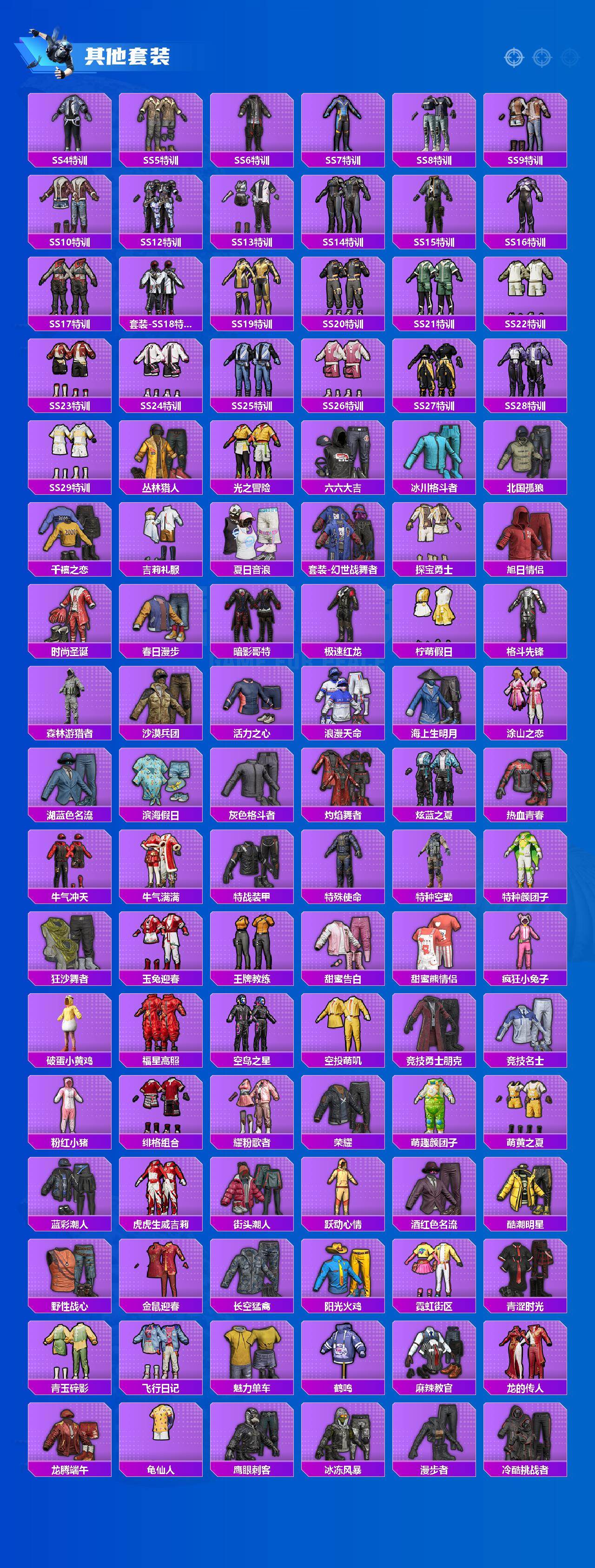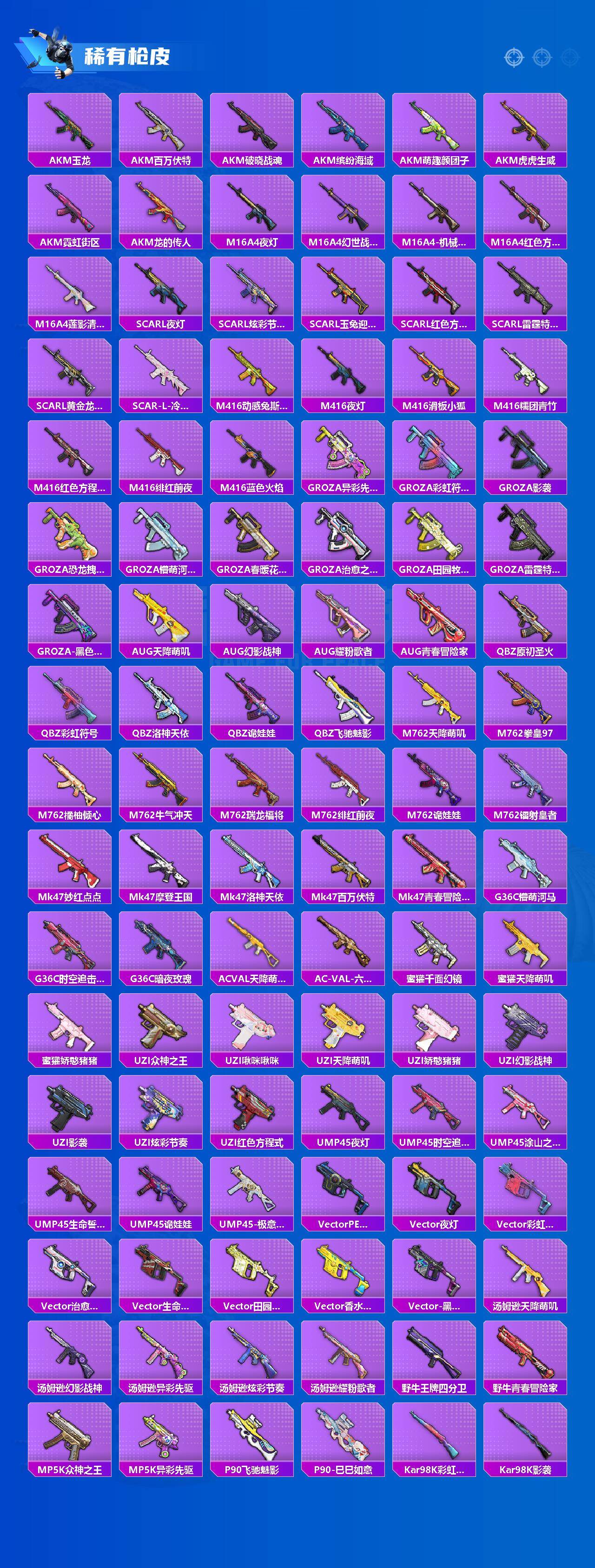 AKM-炫紫旋律,SCAR-L-青春物语,SCAR-L-锦绣绵绵,M416-五爪金龙,GROZA-香水柠檬,AUG-暖羊咩咩,UMP45-恐龙拽拽,Kar98K-巳巳如意,MG3-洛神天依