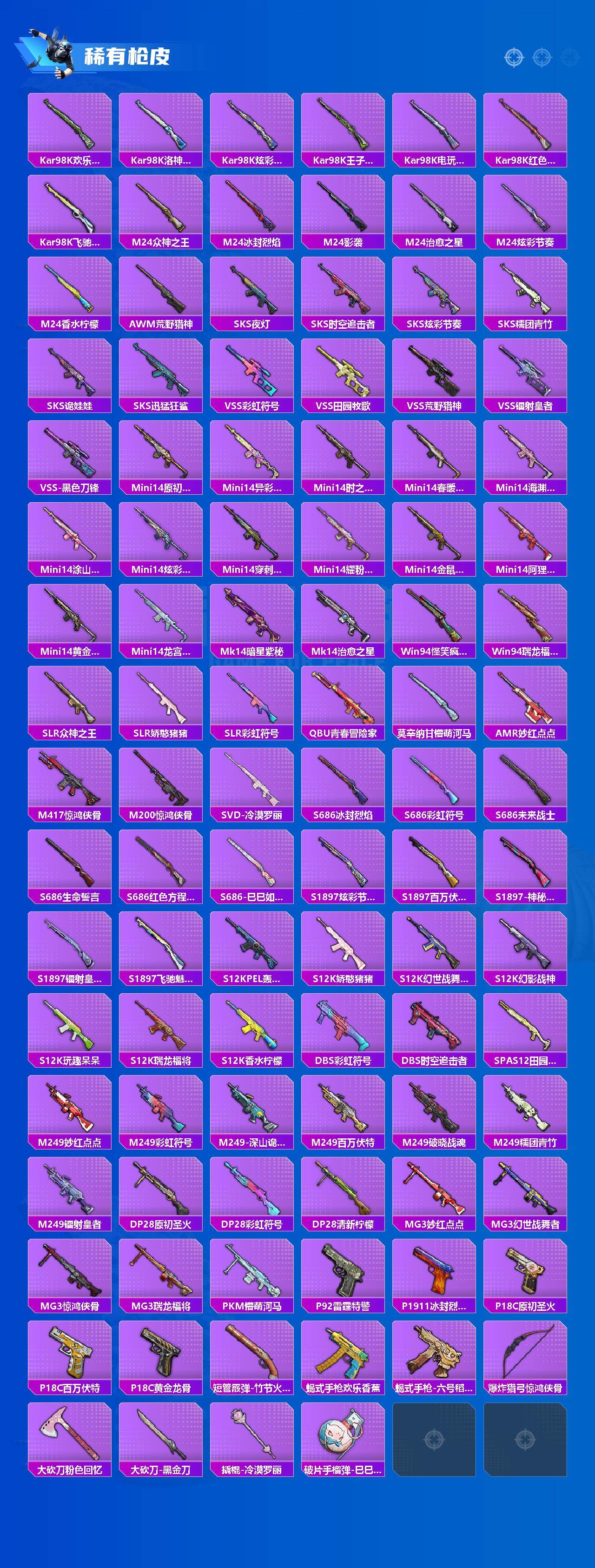 【稀有枪皮】:AKM-冰凉西瓜,AKM-夜灯,AKM-彩虹符号,AKM-影袭,AKM-春暖花开,AKM-灼热熔岩,AKM-玉龙,AKM-百万伏特,AKM-破晓战魂,AKM-缤纷海域,AKM-萌趣颜团子,AKM-虎虎生威,AKM-霓虹街区,AKM-龙的传人,M16A4-夜灯,M16A4-幻世战舞者,M16A4-机械英豪,M