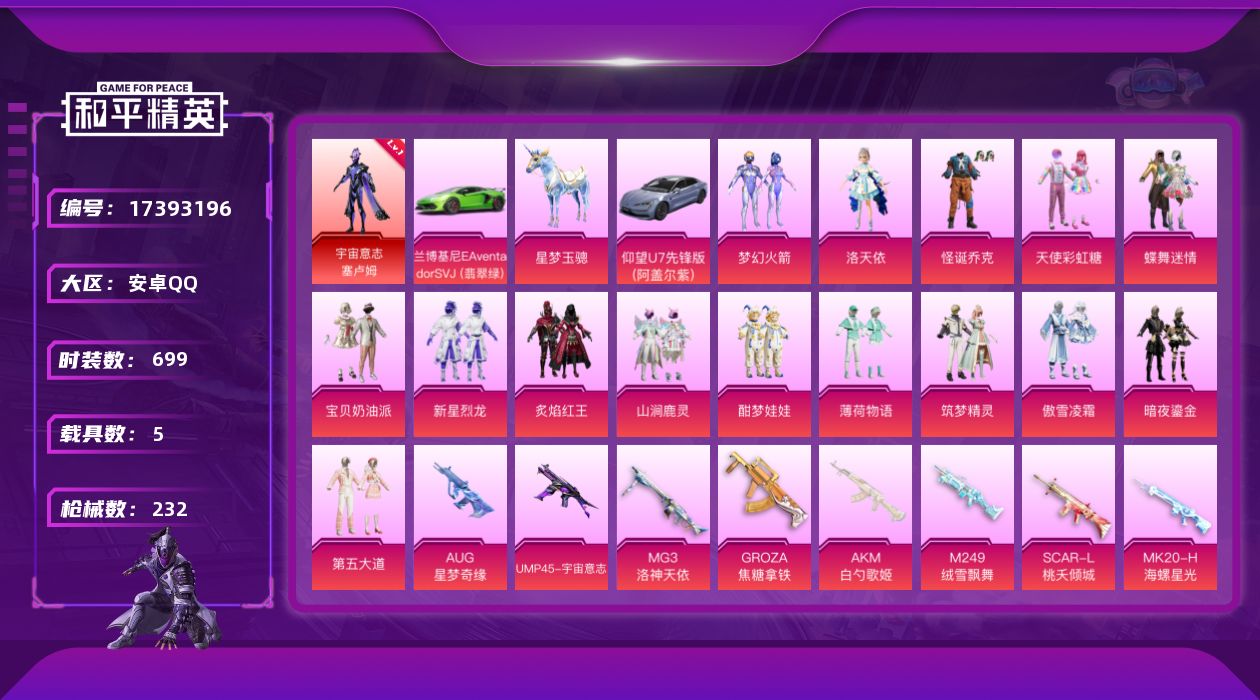 - [18031443]安卓 手Q-4粉装-7特效枪-0载具-1粉色飞行器-59759热力值-15王牌印记-161套装-222枪皮 【热门品类】:套装-浪漫天命,套装-深海小丑鱼,套装-小丑鱼,套装-龟仙人 【粉色套装】:角色-洛天依,粉装-恐龙拽拽,角色-萨利娅,角色-异瞳寒姬 【粉色枪皮等级】:M416-电玩时刻(五级),UMP45-量子极限(五级),UMP45-萌骑冒险(五级),AKS-74U-森灵之息(五级),Kar98K-巳巳如意(五级),Mk14-福马献瑞(二级),DP-28-豹影疾电(五级) 【粉色枪皮】:M416-电玩时刻,UMP45-量子极限,UMP45-萌骑冒险,AKS-74U-森灵之息,Kar98K-巳巳如意,Mk14-福马献瑞,DP-28-豹影疾电 【粉色飞行器】:炫彩糖果飞行器 【粉色降落伞】:天之羽翼降落伞,第五大道降落伞,仲夏莫吉托降落伞,江南烟雨降落伞,精灵梦叶罗丽降落伞,星梦奇缘降落伞,金丰海韵降落伞,千金淑猫降落伞,星穹咏叹调降落伞,幻彩电音降落伞,炫彩糖果降落伞 【稀有套装】:套装-龟仙人,套装-巳巳如意,套装-炫彩糖果,套装-彩虹骑师,套装-马上来财,套装-大漠长歌,套装-雏菊兔兔,套装-萝兰蝴蝶,套装-小熊娃娃,套装-糖糖葫芦,套装-青团波波,套装-棉花软糖,角色-摩登魅猫,套装-燕燕于飞,套装-鱼渊荷华,玩偶服-小狗蛇点点,套装-粉恋花,套装-紫幽梦,套装-蓝冰羽,套装-星影赞美诗,套装-云朵鹅,套装-雪绒豹,角色-夜瞳黯灵,套装-朱霞炽焰,套装-凌霄紫焰,角色-绯色魅影,套装-雨过天青,套装-红釉青花 【稀有枪皮】:AUG-冰晶雪宝,AKM-彩虹符号,AKM-百万伏特,AKM-破晓战魂,AKM-缤纷海域,AKM-龙的传人,M16A4-幻世战舞者,M16A4-红色方程式,M16A4-莲影清波,M16A4-蓝色火焰,SCAR-L-夜灯,SCAR-L-炫彩节奏,SCAR-L-玉兔迎春,SCAR-L-红色方程式,SCAR-L-小狗蛇点点,M416-糯团青竹,M416-红色方程式,M416-蓝色火焰,GROZA-彩虹符号,GROZA-恐龙拽拽,GROZA-懵萌河马,GROZA-春暖花开,GROZA-荧海星豚,AUG-天降萌叽,AUG-耀粉歌者,M762-天降萌叽,M762-云朵鹅,Mk47-妙红点点,G36C-懵萌河马,G36C-星穹咏叹调,AC-VA