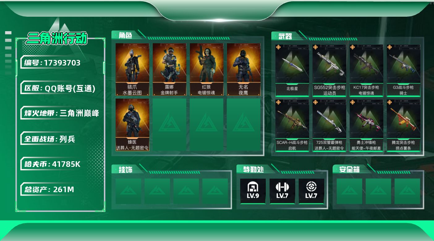 [17393703]可二次【店主推荐捡漏号】261m总资产-41785k哈伏币-60烽火等级-三角洲巅峰-17战场等级-列兵 【干员外观】:骇爪-水墨云图,蜂医-送葬人·无题密令,无名-夜鹰,红狼-电锯惊魂,露娜-金牌射手 【近战皮肤】:近战-北极星,近战-黑鹰 【传说外观】:M4A1突击步枪-蚀金玫瑰,M4A1突击步枪-阿米娅,SG552突击步枪-运动员,AK-12突击步枪-夜鹰,AK-12突击步枪-特斯拉线圈,SCAR-H战斗步枪-水墨云图,SCAR-H战斗步枪-启航,G3战斗步枪-骑士,CAR-15突击步枪-阿米娅,腾龙突击步枪-捞点薯条,K437突击步枪-北极星,KC17突击步枪-电锯惊魂,UZI冲锋枪-特斯拉线圈,SMG-45冲锋枪-骑士,SR-3M紧凑突击步枪-特斯拉线圈,勇士冲锋枪-能天使-午夜邮差,QCQ171冲锋枪-北极星,725双管霰弹枪-送葬人-无题密令,SR-25射手步枪-水墨云图,AWM狙击步枪-捞点薯条,93R-捞点薯条,复合弓-黑·天际线 【史诗外观】:AKM突击步枪-林中猎手,QBZ95-1突击步枪-曙光,ASh-12战斗步枪-守夜人,M16A4突击步枪-竞赛选手,M7战斗步枪-百步穿杨,SG552突击步枪-尖端治疗,SG552突击步枪-深海恐惧,SCAR-H战斗步枪-囚徒,G3战斗步枪-流沙送葬,AS Val突击步枪-尖端治疗,AS Val突击步枪-百步穿杨,腾龙突击步枪-无垢,腾龙突击步枪-猎鳄行动,MP5冲锋枪-深海恐惧,MP5冲锋枪-战术竞备,MP5冲锋枪-竞技风,Vector冲锋枪-阿萨拉文明,Vector冲锋枪-百步穿杨,SR-3M紧凑突击步枪-荒野求生,SR-3M紧凑突击步枪-战术竞备,勇士冲锋枪-深海恐惧,勇士冲锋枪-工业狂潮,MP7冲锋枪-无垢,M1014霰弹枪-林中猎手,PKM通用机枪-蝮蛇,PKM通用机枪-守夜人,PKM通用机枪-荒野求生,M250通用机枪-囚徒,SVD狙击步枪-暗夜猎手,SVD狙击步枪-荒野求生,M14射手步枪-黑鹰坠落,M14射手步枪-工业狂潮,SR-25射手步枪-尖端治疗,PSG-1射手步枪-无垢,SV-98狙击步枪-林中猎手,SV-98狙击步枪-囚徒,M700狙击步枪-守夜人,M700狙击步枪-百步穿杨,AWM狙击步枪-流沙送葬,QSZ92G-风林火山,.357左轮-幸运时刻 【稀有外观】:M4A1突击步枪