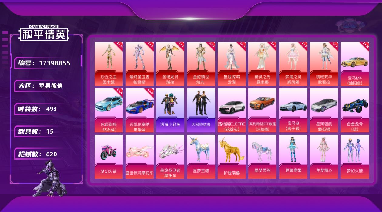 [17398855]【1766】苹果 微信-无敌战神框-8神装-70粉装-37特效枪-15载具-27粉色飞行器-307059热力值-27王牌印记-493套装-620枪皮