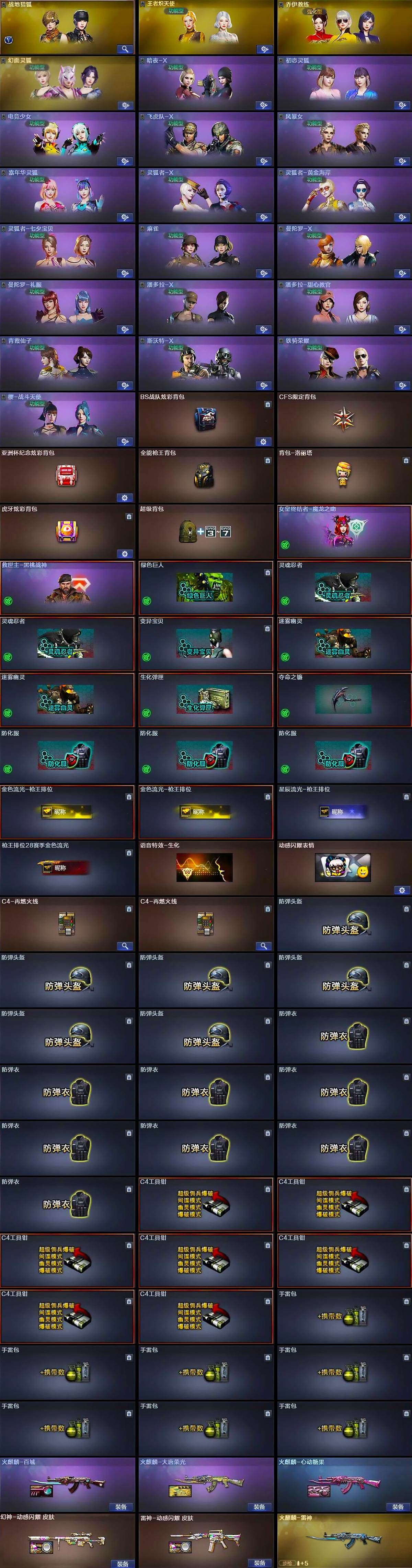 【道具】:BS战队炫彩背包,CFS限定背包,亚洲杯纪念炫彩背包,全能枪王背包,背包-洛丽塔,虎牙炫彩背包,超级背包,哔哩哔哩名片,女皇终结者-魔龙之吻,救世主-黑桃战神,绿色巨人,灵魂忍者*2,变异宝贝,迷雾幽灵*2,生化弹匣,夺命之镰,防化服*3,金色流光-枪王排位*2,星辰流光-枪王排位,枪王排位28赛季金色流光,语音特效-生化,动感闪耀表情,C4-再燃火线*2,防弹头盔*6,防弹衣*8,C4工具钳*7,手雷包*7