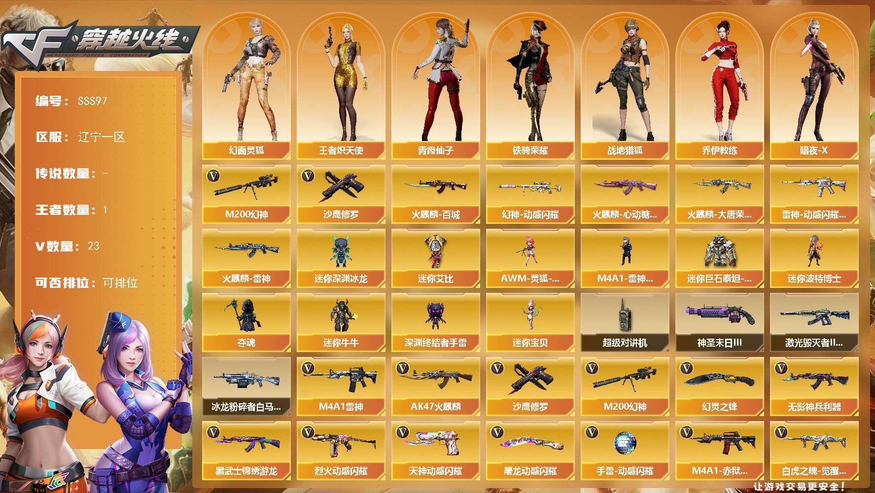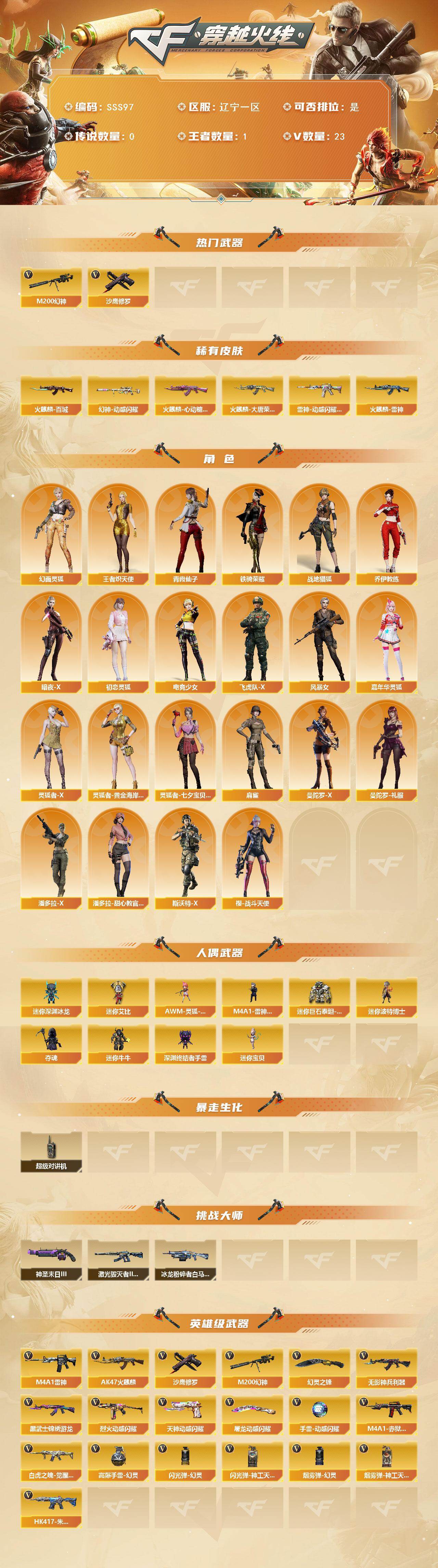 [17398933]辽宁一区-27V-1王者武器数-0炫金武器数 【热门武器】:M200-幻神,沙鹰-修罗 【皮肤】:幻神-动感闪耀 皮肤,雷神-动感闪耀 皮肤,火麒麟-雷神,火麒麟-百城,火麒麟-大唐荣光,火麒麟-心动糖果 【角色】:战地猎狐,王者炽天使,乔伊教练,幻面灵狐,暗夜-X,初恋灵狐,电竞少女,飞虎队-X,风暴女,嘉年华灵狐,灵狐者-X,灵狐者-黄金海岸,灵狐者-七夕宝贝,麻雀,曼陀罗-X,曼陀罗-礼服,潘多拉-X,潘多拉-甜心教官,青霞仙子,斯沃特-X,铁骑荣耀,樱-战斗天使 【人偶武器】:M4A1-雷神-精英刀锋,迷你宝贝,AWM-灵狐-15周年嘉年华*2,迷你深渊冰龙,迷你波特博士,夺魂,迷你牛牛,深渊终结者手雷*2,迷你艾比,迷你巨石泰坦-魔花研究所 【暴走生化】:超级对讲机 【挑战大师】:冰龙粉碎者-白马银枪,激光毁灭者III-白马银枪*2,神圣爆裂者-末日III 【英雄级武器】:AK47-火麒麟*2,M4A1-雷神,无影-神兵利器,黑武士-锦绣游龙,烈火-动感闪耀,白虎之魄-觉醒版,HK417-朱雀-电竞之星,机械迷城-穹宇,M200-幻神,沙鹰-修罗,天神-动感闪耀,幻灵之锋,屠龙-动感闪耀,高爆手雷-幻灵,手雷-动感闪耀,闪光弹-幻灵,闪光弹-神工天巧,烟雾弹-幻灵,烟雾弹-神工天巧,M4A1-赤狱骑士 【道具】:BS战队炫彩背包,CFS限定背包,亚洲杯纪念炫彩背包,全能枪王背包,背包-洛丽塔,虎牙炫彩背包,超级背包,哔哩哔哩名片,女皇终结者-魔龙之吻,救世主-黑桃战神,绿色巨人,灵魂忍者*2,变异宝贝,迷雾幽灵*2,生化弹匣,夺命之镰,防化服*3,金色流光-枪王排位*2,星辰流光-枪王排位,枪王排位28赛季金色流光,语音特效-生化,动感闪耀表情,C4-再燃火线*2,防弹头盔*6,防弹衣*8,C4工具钳*7,手雷包*7 【特殊枪械】: