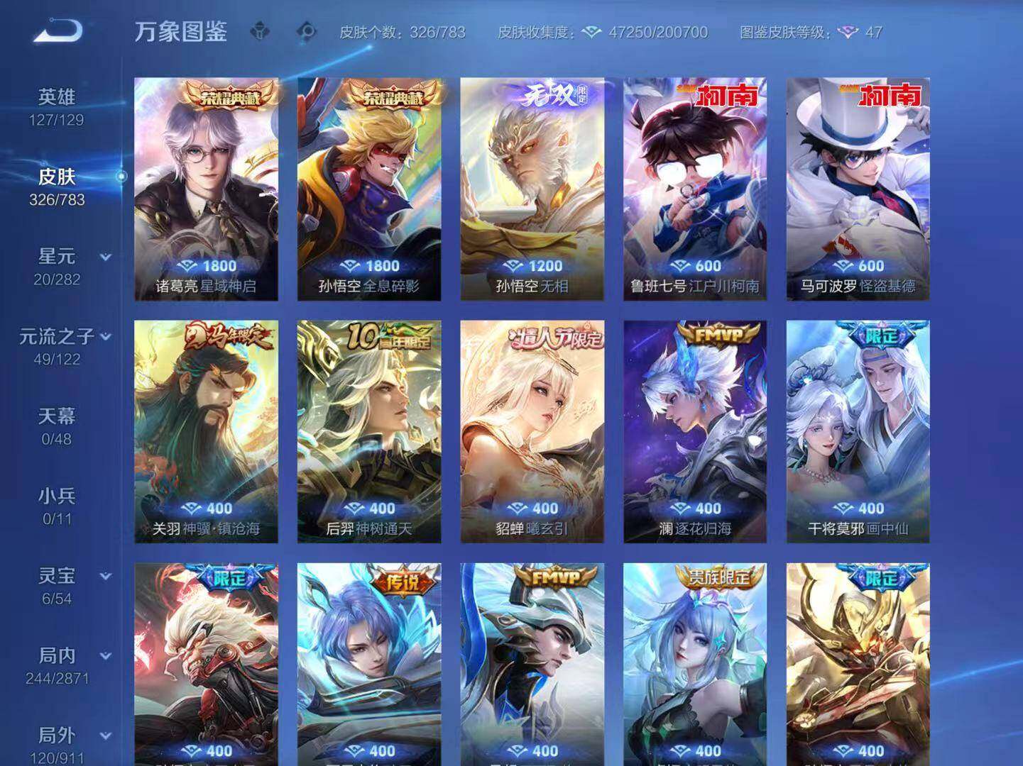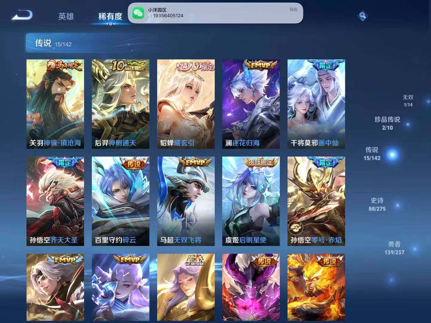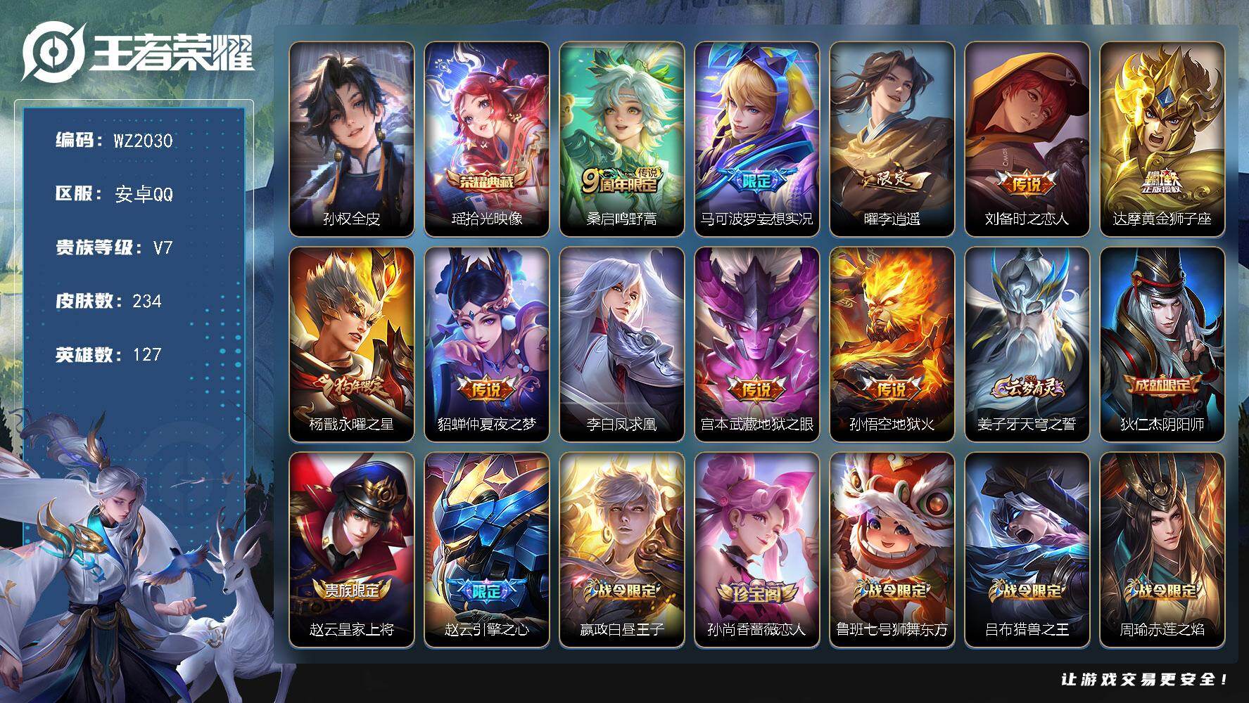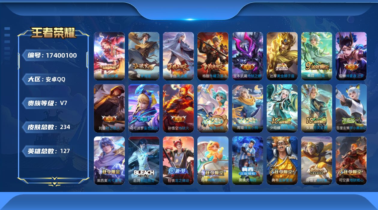 - [15147171]安卓WX-V8-最强王者段位-127英雄-238皮肤-2典藏皮肤-1珍品传说-21传说-67史诗-1星传说(孙悟空:幽冥火) 【英雄全皮】:蒙恬全皮 【荣耀典藏】:诸葛亮星域神启,铠银白咏叹调 【珍品传说】:马可波罗怪盗基德 【传说皮肤】:后羿神树通天,女娲愿照千秋盛,澜愿照九州拓,云缨幻光神枪,桑启鸣野蒿,典韦战鼓燎原,澜逐花归海,露娜霜月吟,吕布遇见神鼓,宫本武藏惊梅引,李白诗剑行,百里守约碎云,西施游龙清影,虞姬启明星使,曜云鹰飞将,李信一念神魔,貂蝉猫影幻舞,干将莫邪久胜战神,虞姬云霓雀翎,梦奇胖达荣荣,孙悟空地狱火 【限定皮肤】:姜子牙天穹之誓,杨戬破阵退雄兵,狄仁杰阴阳师,赵云皇家上将,墨子神迹守卫,孙尚香蔷薇恋人,鲁班七号乒乒小将,吕布猎兽之王,吕布遇见神鼓,元歌无心,狄仁杰魔术师,狄仁杰万华元夜,项羽海滩派对,程咬金演武夺筹,兰陵王金庭之子,孙悟空孙行者,李元芳云中旅人,虞姬启明星使,钟馗驱傩正仪,杨玉环遇见飞天,干将莫邪胡桃夹子,雅典娜单词大作战,鬼谷子五谷丰年,沈梦溪大漠名商,裴擒虎擒涛扼浪,云中君纤云弄巧,嫦娥拒霜思,鲁班大师探海日志,桑启海盐诗旅,艾琳流音漫舞,司空震地狱燃心,阿古朵江河有灵,张良古海寻踪,蒙犽百解令,蒙恬荣光圣徽,高渐离燃音魔法,妲己灵卜魔法,鬼谷子天穹祈灯,伽罗琥珀纪元,沈梦溪龙舞盛年,刘邦剑破天穹,程咬金群星魔术团,镜青焰无极,项羽苍威无极 【年限皮肤】:马超神威 【赛季限定】:狄仁杰万华元夜,程咬金演武夺筹,兰陵王金庭之子,张良古海寻踪,李元芳云中旅人,钟馗驱傩正仪,沈梦溪大漠名商,裴擒虎擒涛扼浪,鲁班大师探海日志,桑启海盐诗旅,鬼谷子天穹祈灯,蒙恬荣光圣徽,刘邦剑破天穹,姜子牙天穹之誓 【战令限定】:墨子神迹守卫,吕布猎兽之王,艾琳流音漫舞,雅典娜单词大作战,司空震地狱燃心,高渐离燃音魔法,妲己灵卜魔法,镜青焰无极,项羽苍威无极 【史诗皮肤】:项羽苍穹之光,露娜紫霞仙子,赵云皇家上将,赵云未来纪元,甄姬冰雪圆舞曲,狄仁杰魔术师,廉颇地狱岩魂,宫本武藏鬼剑武藏,孙尚香蔷薇恋人,孙尚香水果甜心,嬴政暗夜贵公子,妲己魅力维加斯,妲己女仆咖啡,墨子金属风暴,吕布圣诞狂欢,刘禅绅士熊喵,曹操幽灵船长,花木兰水晶猎龙者,夏侯惇乘风破浪,小乔缤纷独角兽,兰陵王暗隐猎兽者,诸葛亮黄金分割率,亚瑟心灵战警,安琪拉心灵骇客,百里守约特