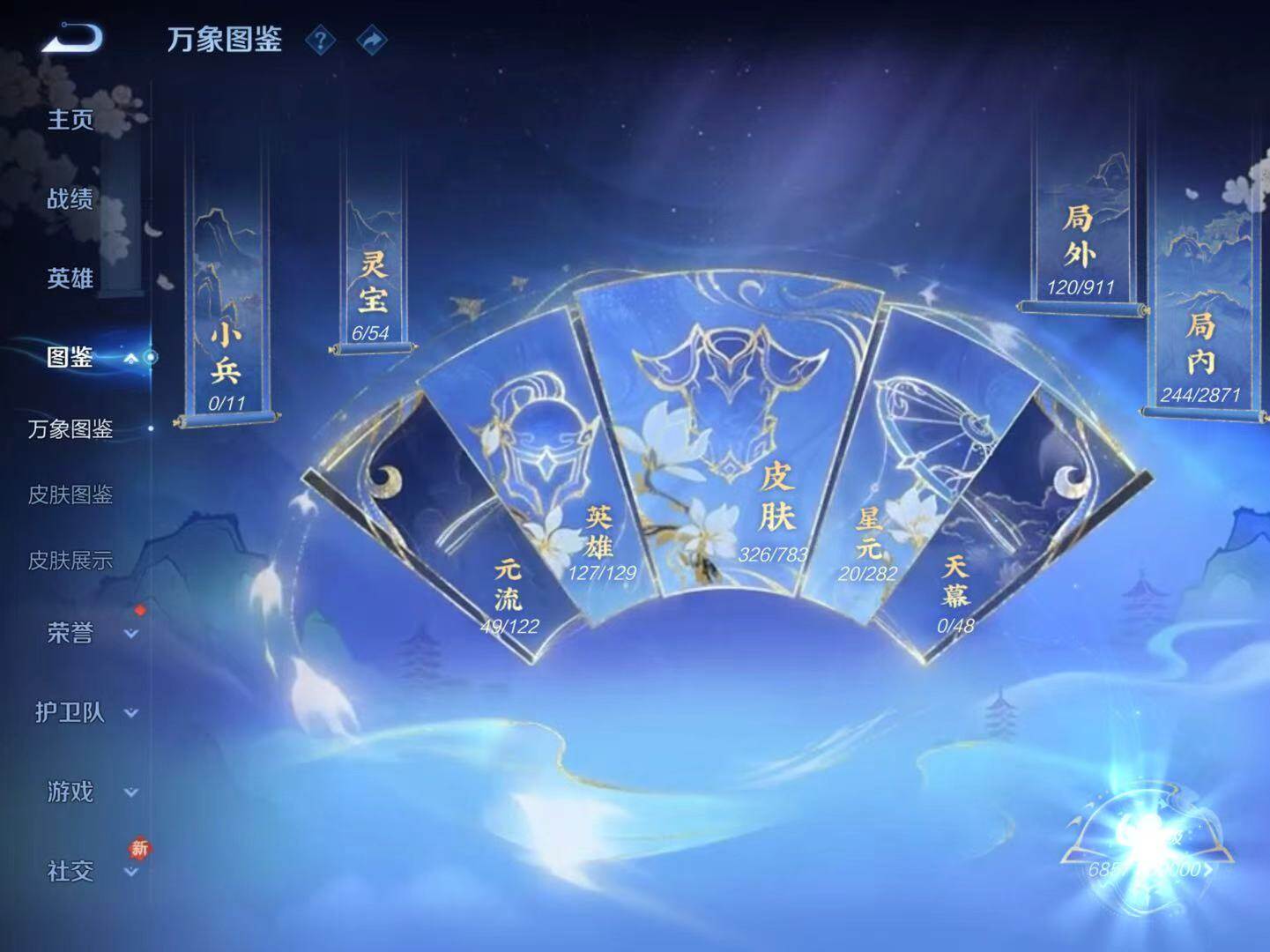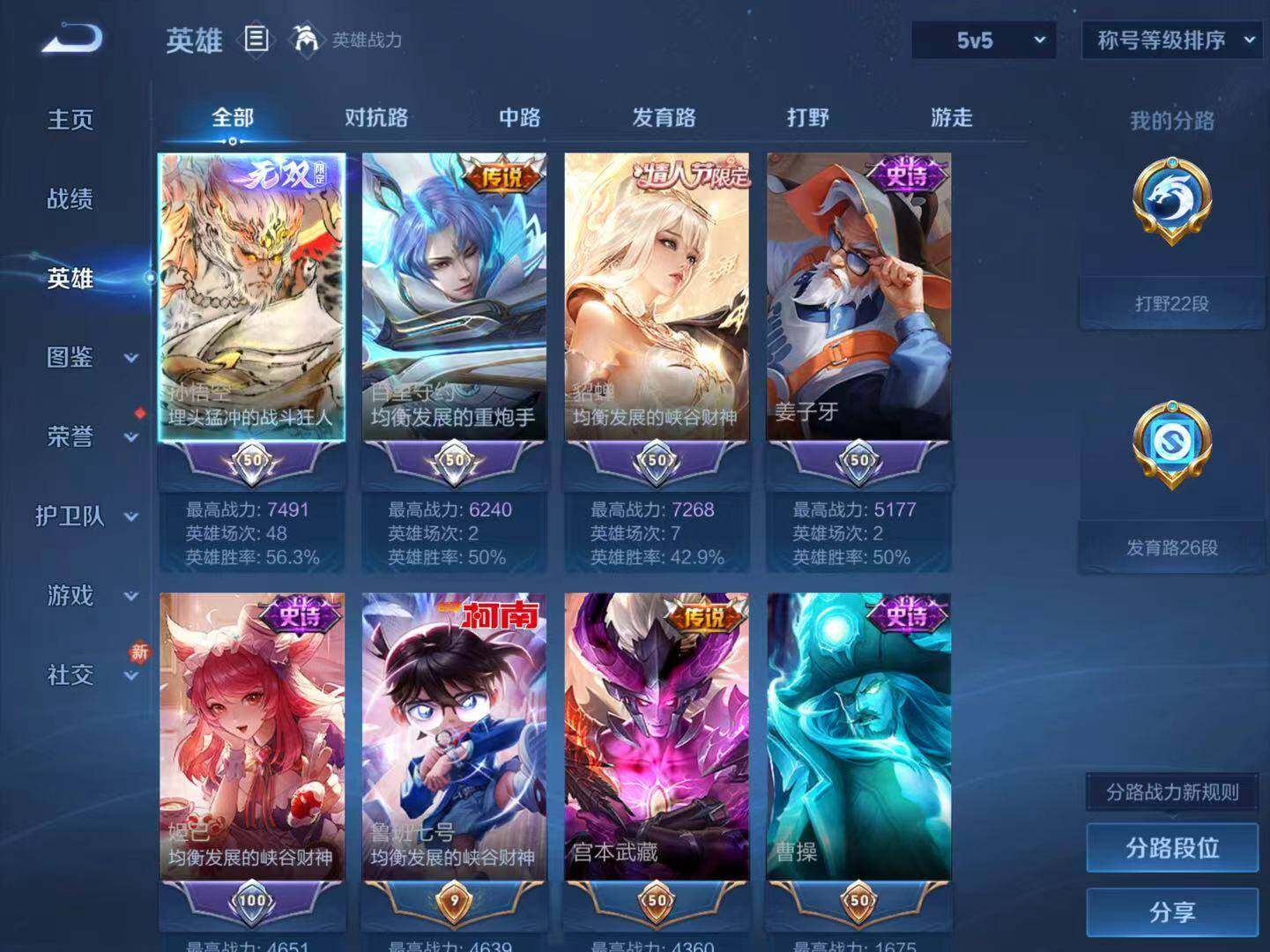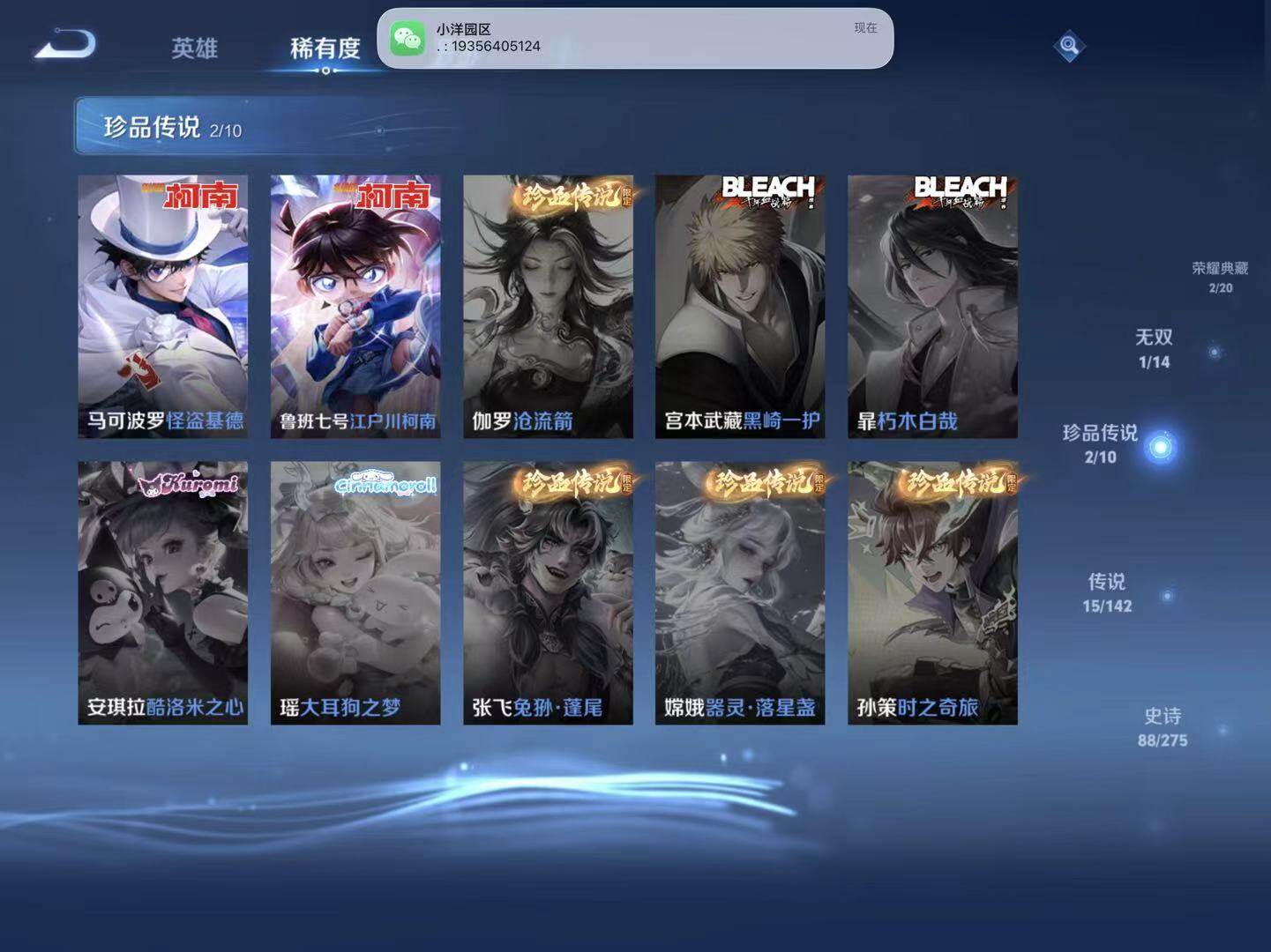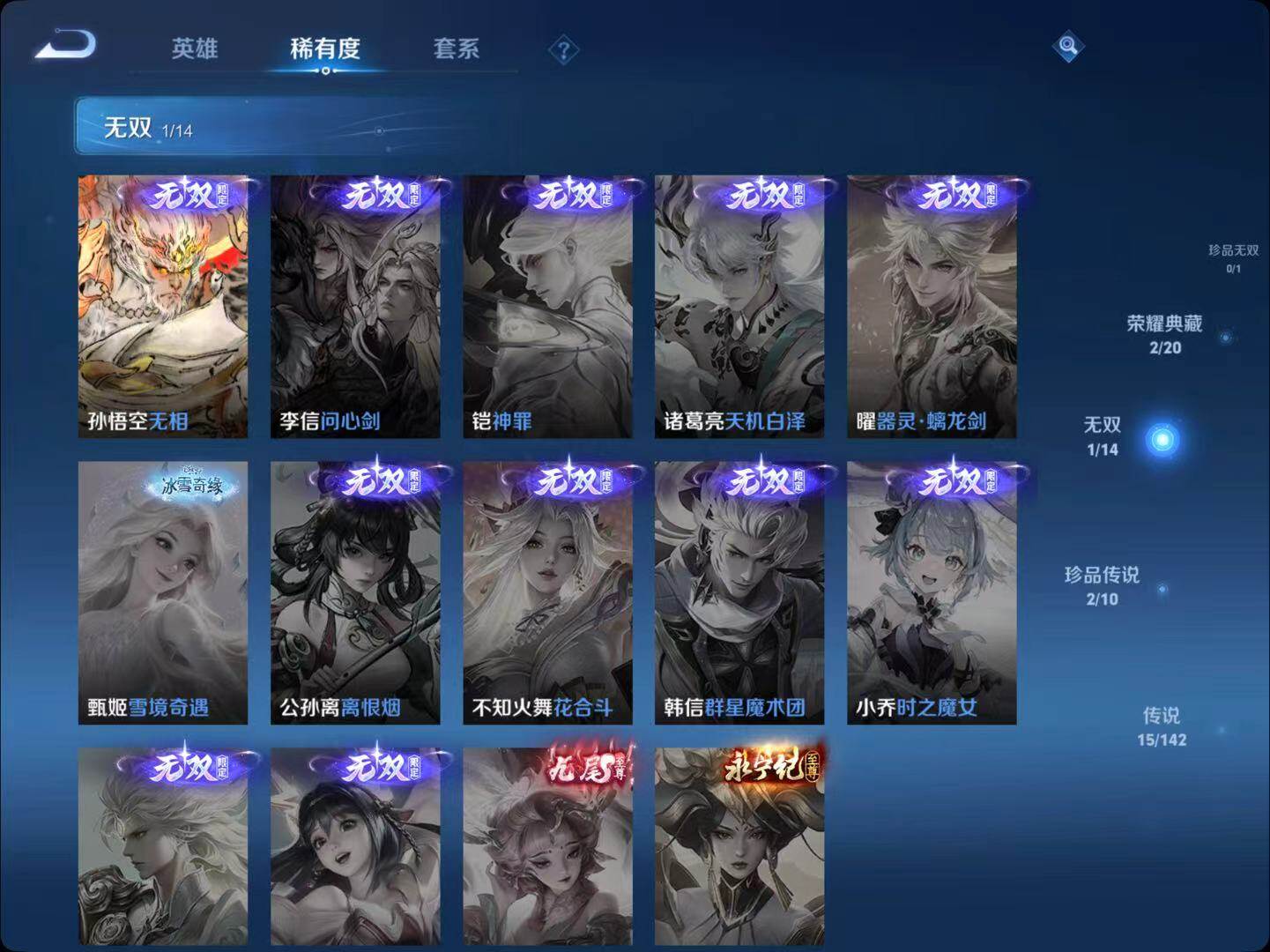 - [15147171]安卓WX-V8-最强王者段位-127英雄-238皮肤-2典藏皮肤-1珍品传说-21传说-67史诗-1星传说(孙悟空:幽冥火) 【英雄全皮】:蒙恬全皮 【荣耀典藏】:诸葛亮星域神启,铠银白咏叹调 【珍品传说】:马可波罗怪盗基德 【传说皮肤】:后羿神树通天,女娲愿照千秋盛,澜愿照九州拓,云缨幻光神枪,桑启鸣野蒿,典韦战鼓燎原,澜逐花归海,露娜霜月吟,吕布遇见神鼓,宫本武藏惊梅引,李白诗剑行,百里守约碎云,西施游龙清影,虞姬启明星使,曜云鹰飞将,李信一念神魔,貂蝉猫影幻舞,干将莫邪久胜战神,虞姬云霓雀翎,梦奇胖达荣荣,孙悟空地狱火 【限定皮肤】:姜子牙天穹之誓,杨戬破阵退雄兵,狄仁杰阴阳师,赵云皇家上将,墨子神迹守卫,孙尚香蔷薇恋人,鲁班七号乒乒小将,吕布猎兽之王,吕布遇见神鼓,元歌无心,狄仁杰魔术师,狄仁杰万华元夜,项羽海滩派对,程咬金演武夺筹,兰陵王金庭之子,孙悟空孙行者,李元芳云中旅人,虞姬启明星使,钟馗驱傩正仪,杨玉环遇见飞天,干将莫邪胡桃夹子,雅典娜单词大作战,鬼谷子五谷丰年,沈梦溪大漠名商,裴擒虎擒涛扼浪,云中君纤云弄巧,嫦娥拒霜思,鲁班大师探海日志,桑启海盐诗旅,艾琳流音漫舞,司空震地狱燃心,阿古朵江河有灵,张良古海寻踪,蒙犽百解令,蒙恬荣光圣徽,高渐离燃音魔法,妲己灵卜魔法,鬼谷子天穹祈灯,伽罗琥珀纪元,沈梦溪龙舞盛年,刘邦剑破天穹,程咬金群星魔术团,镜青焰无极,项羽苍威无极 【年限皮肤】:马超神威 【赛季限定】:狄仁杰万华元夜,程咬金演武夺筹,兰陵王金庭之子,张良古海寻踪,李元芳云中旅人,钟馗驱傩正仪,沈梦溪大漠名商,裴擒虎擒涛扼浪,鲁班大师探海日志,桑启海盐诗旅,鬼谷子天穹祈灯,蒙恬荣光圣徽,刘邦剑破天穹,姜子牙天穹之誓 【战令限定】:墨子神迹守卫,吕布猎兽之王,艾琳流音漫舞,雅典娜单词大作战,司空震地狱燃心,高渐离燃音魔法,妲己灵卜魔法,镜青焰无极,项羽苍威无极 【史诗皮肤】:项羽苍穹之光,露娜紫霞仙子,赵云皇家上将,赵云未来纪元,甄姬冰雪圆舞曲,狄仁杰魔术师,廉颇地狱岩魂,宫本武藏鬼剑武藏,孙尚香蔷薇恋人,孙尚香水果甜心,嬴政暗夜贵公子,妲己魅力维加斯,妲己女仆咖啡,墨子金属风暴,吕布圣诞狂欢,刘禅绅士熊喵,曹操幽灵船长,花木兰水晶猎龙者,夏侯惇乘风破浪,小乔缤纷独角兽,兰陵王暗隐猎兽者,诸葛亮黄金分割率,亚瑟心灵战警,安琪拉心灵骇客,百里守约特