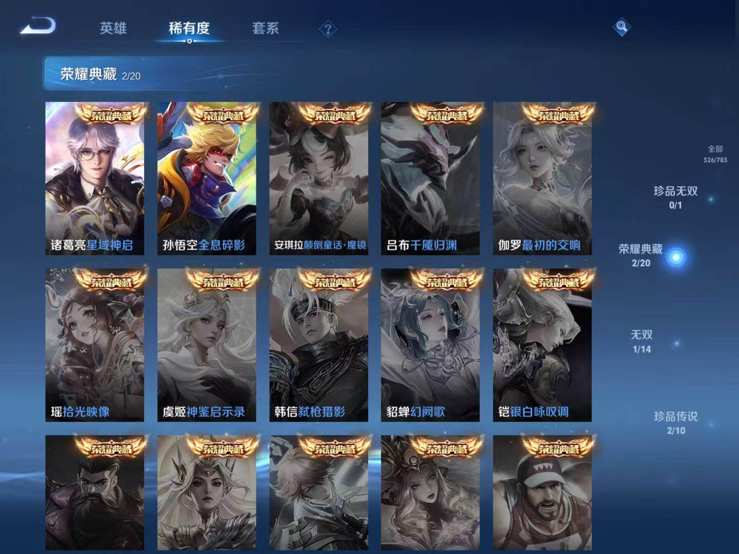 裴擒虎李小龙,上官婉儿梁祝,韩信逐梦之影,虞姬霸王别姬,孙悟空大圣娶亲,裴擒虎梅西,赵云引擎之心,孙悟空孙行者,桑启鸣野蒿