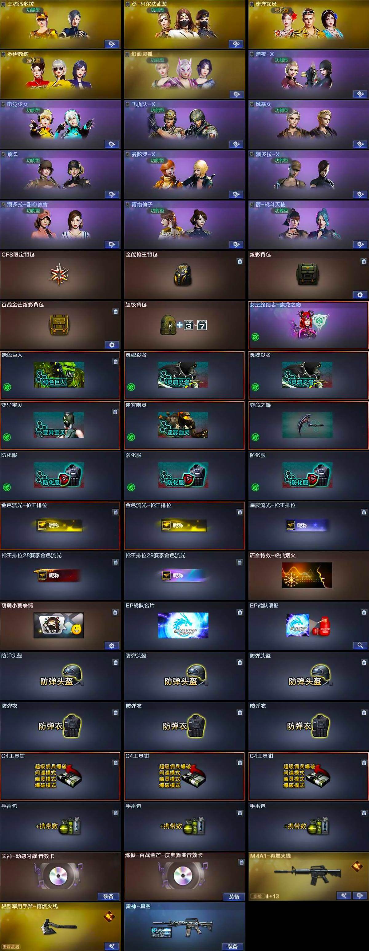 【道具】:CFS限定背包,全能枪王背包,炫彩背包,百战金芒炫彩背包,超级背包,女皇终结者-魔龙之吻,绿色巨人,灵魂忍者*2,变异宝贝,迷雾幽灵,夺命之镰,防化服*3,金色流光-枪王排位*2,星辰流光-枪王排位,枪王排位28赛季金色流光,枪王排位29赛季金色流光,语音特效-盛典烟火,萌萌小葵表情,EP战队名片,EP战队喷图,防弹头盔*3,防弹衣*3,C4工具钳*3,手雷包*3