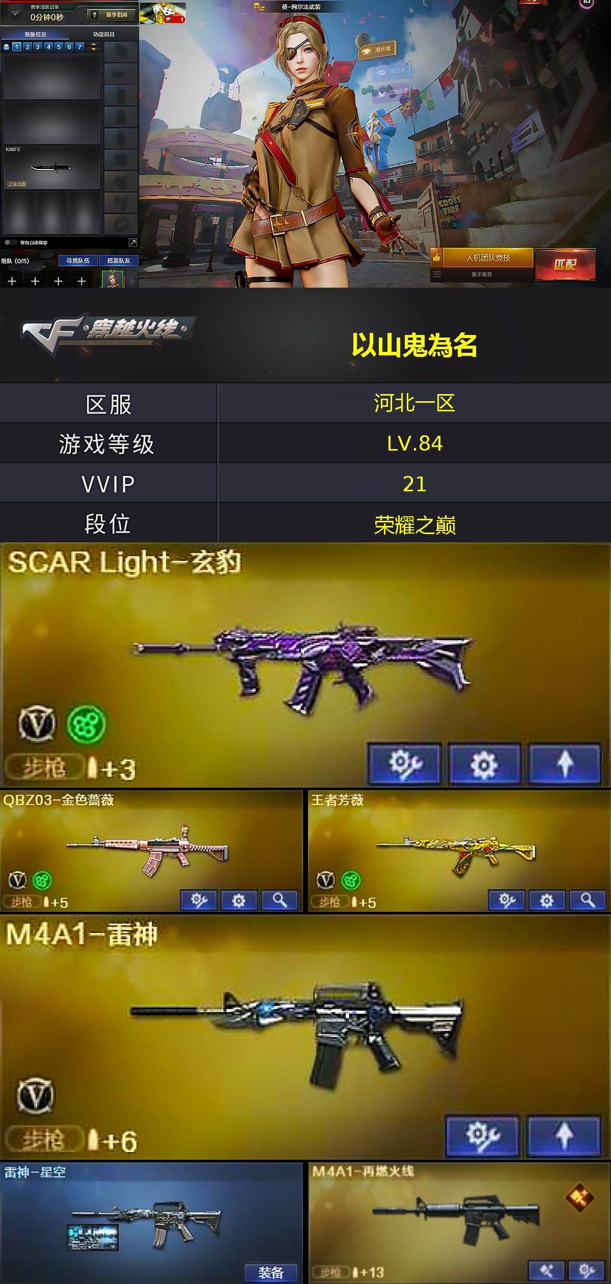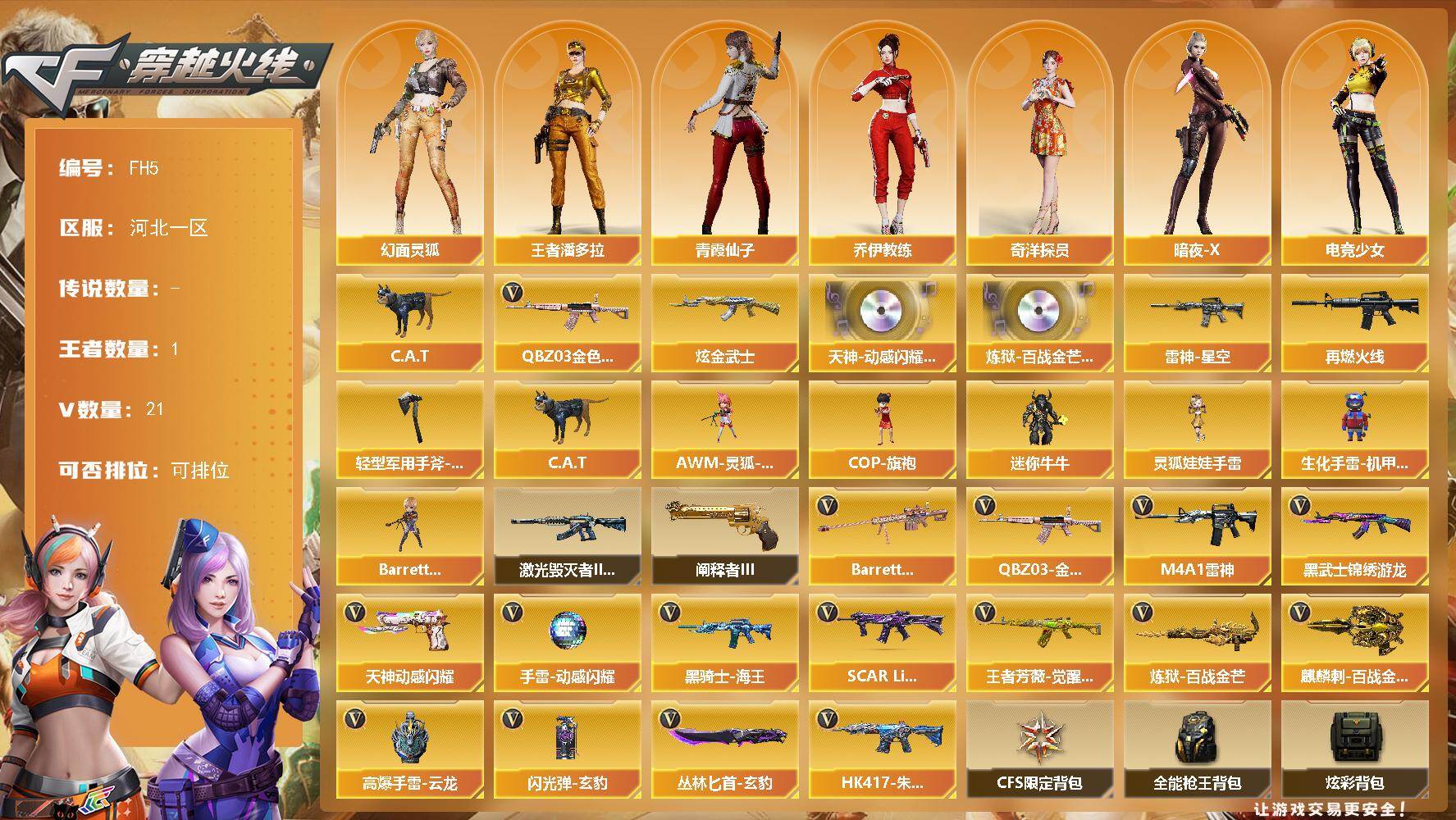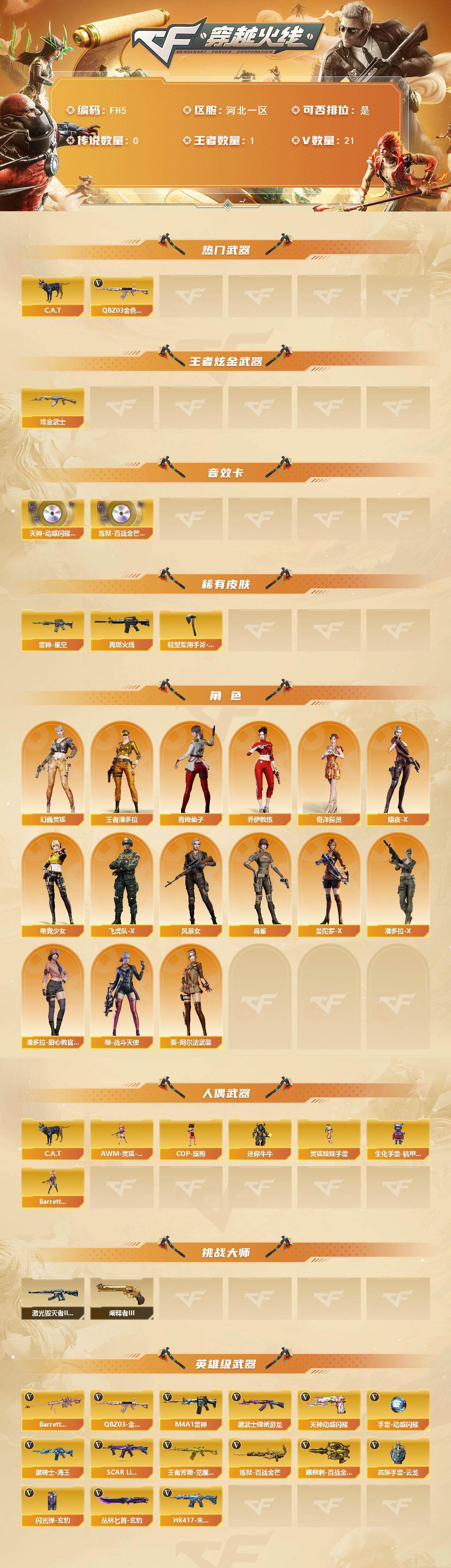 [17400479]河北一区-24V-1王者武器数-1炫金武器数 【热门武器】:QBZ03-金色蔷薇,C.A.T 【王者炫金武器】:炫金武士 【音效卡】:天神-动感闪耀 音效卡,炼狱-百战金芒-庆典舞曲音效卡 【皮肤】:雷神-星空,M4A1-再燃火线,轻型军用手斧-再燃火线 【角色】:王者潘多拉,奇洋探员,乔伊教练,葵-阿尔法武装,幻面灵狐,暗夜-X,电竞少女,飞虎队-X,风暴女,麻雀,曼陀罗-X,潘多拉-X,潘多拉-甜心教官,青霞仙子,樱-战斗天使 【人偶武器】:Barrett-云海玲珑,AWM-灵狐-15周年嘉年华,COP-旗袍,C.A.T,迷你牛牛,生化手雷-机甲核心,灵狐娃娃手雷 【挑战大师】:激光毁灭者III-白马银枪,阐释者III 【英雄级武器】:M4A1-雷神,黑武士-锦绣游龙,SCAR Light-玄豹,QBZ03-金色蔷薇,黑骑士-海王,王者芳薇-觉醒版,HK417-朱雀-电竞之星,机械迷城-穹宇,Barrett-金色蔷薇,炼狱-百战金芒,天神-动感闪耀,麒麟刺-百战金芒,丛林匕首-玄豹,手雷-动感闪耀,高爆手雷-云龙,闪光弹-玄豹 【道具】:CFS限定背包,全能枪王背包,炫彩背包,百战金芒炫彩背包,超级背包,女皇终结者-魔龙之吻,绿色巨人,灵魂忍者*2,变异宝贝,迷雾幽灵,夺命之镰,防化服*3,金色流光-枪王排位*2,星辰流光-枪王排位,枪王排位28赛季金色流光,枪王排位29赛季金色流光,语音特效-盛典烟火,萌萌小葵表情,EP战队名片,EP战队喷图,防弹头盔*3,防弹衣*3,C4工具钳*3,手雷包*3 【特殊枪械】: