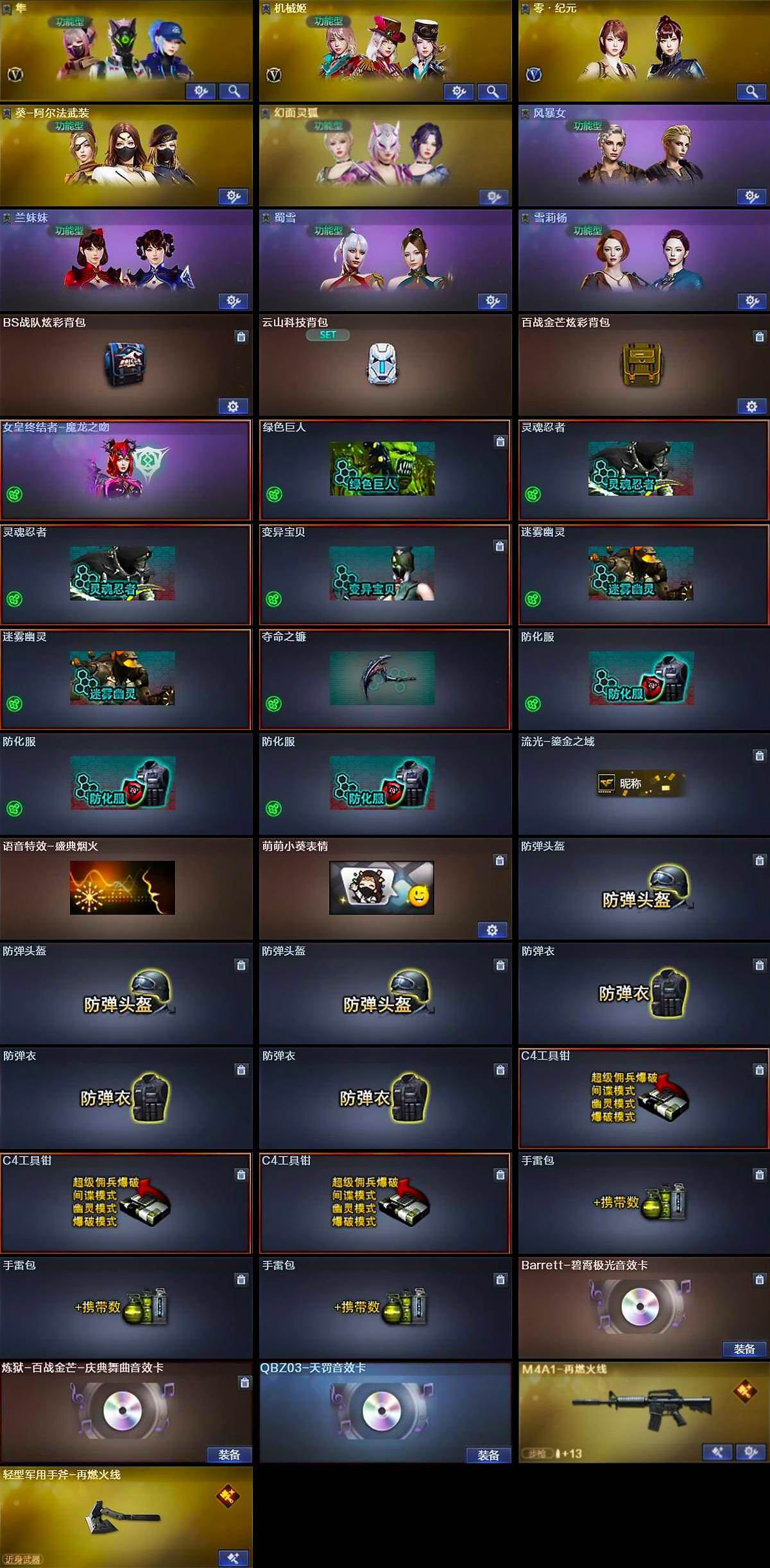 【道具】:BS战队炫彩背包,云山科技背包,百战金芒炫彩背包,女皇终结者-魔龙之吻,绿色巨人,灵魂忍者*2,变异宝贝,迷雾幽灵*2,夺命之镰,防化服*3,流光-鎏金之域,语音特效-盛典烟火,萌萌小葵表情,防弹头盔*3,防弹衣*3,C4工具钳*3,手雷包*3