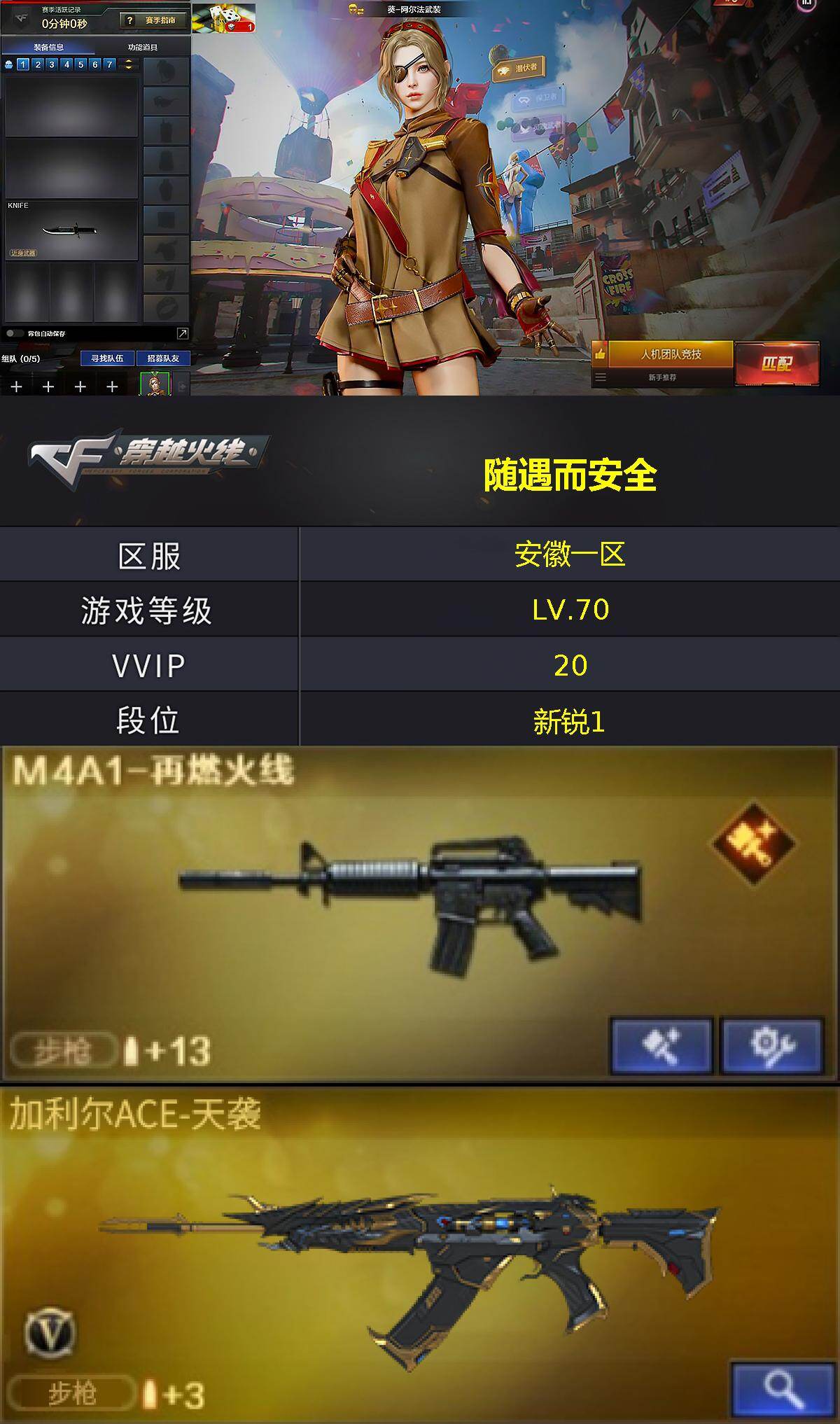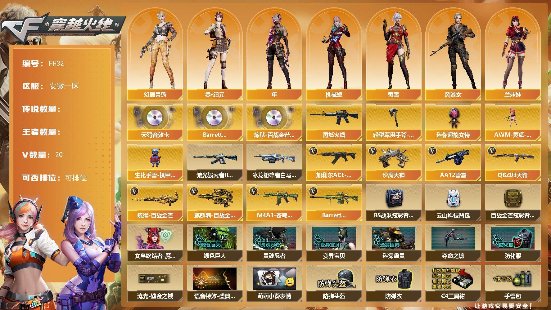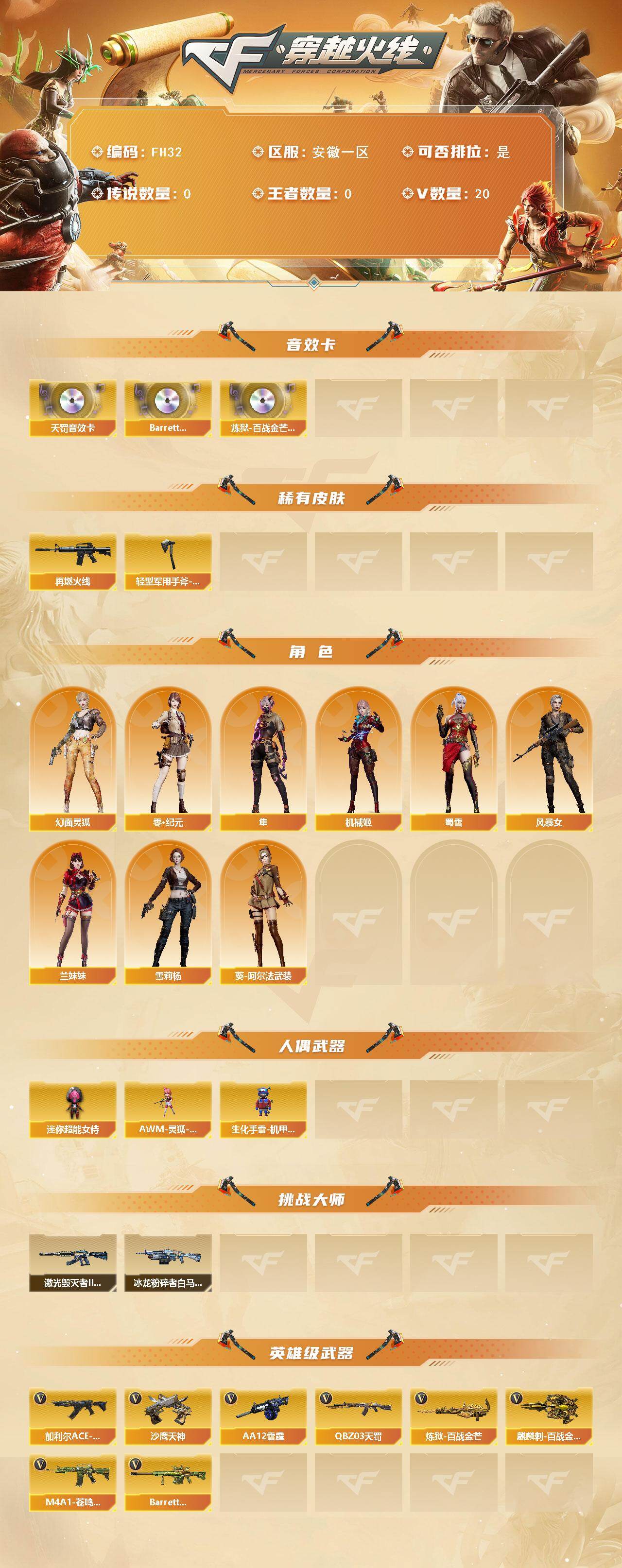 [17401270]安徽一区-21V-0王者武器数-0炫金武器数 【音效卡】:QBZ03-天罚音效卡,Barrett-碧霄极光音效卡,炼狱-百战金芒-庆典舞曲音效卡 【皮肤】:M4A1-再燃火线,轻型军用手斧-再燃火线 【角色】:隼,机械姬,零·纪元,葵-阿尔法武装,幻面灵狐,风暴女,兰妹妹,蜀雪,雪莉杨 【人偶武器】:AWM-灵狐-15周年嘉年华,生化手雷-机甲核心,迷你超能女侍 【挑战大师】:冰龙粉碎者-白马银枪,激光毁灭者III-白马银枪 【英雄级武器】:QBZ03-天罚,加利尔ACE-天袭,机械迷城-穹宇,炼狱-百战金芒,AA-12-雷霆,沙鹰-天神*4,麒麟刺-百战金芒,M4A1-苍鸣雷神,Barrett-碧霄极光 【道具】:BS战队炫彩背包,云山科技背包,百战金芒炫彩背包,女皇终结者-魔龙之吻,绿色巨人,灵魂忍者*2,变异宝贝,迷雾幽灵*2,夺命之镰,防化服*3,流光-鎏金之域,语音特效-盛典烟火,萌萌小葵表情,防弹头盔*3,防弹衣*3,C4工具钳*3,手雷包*3 【特殊枪械】: