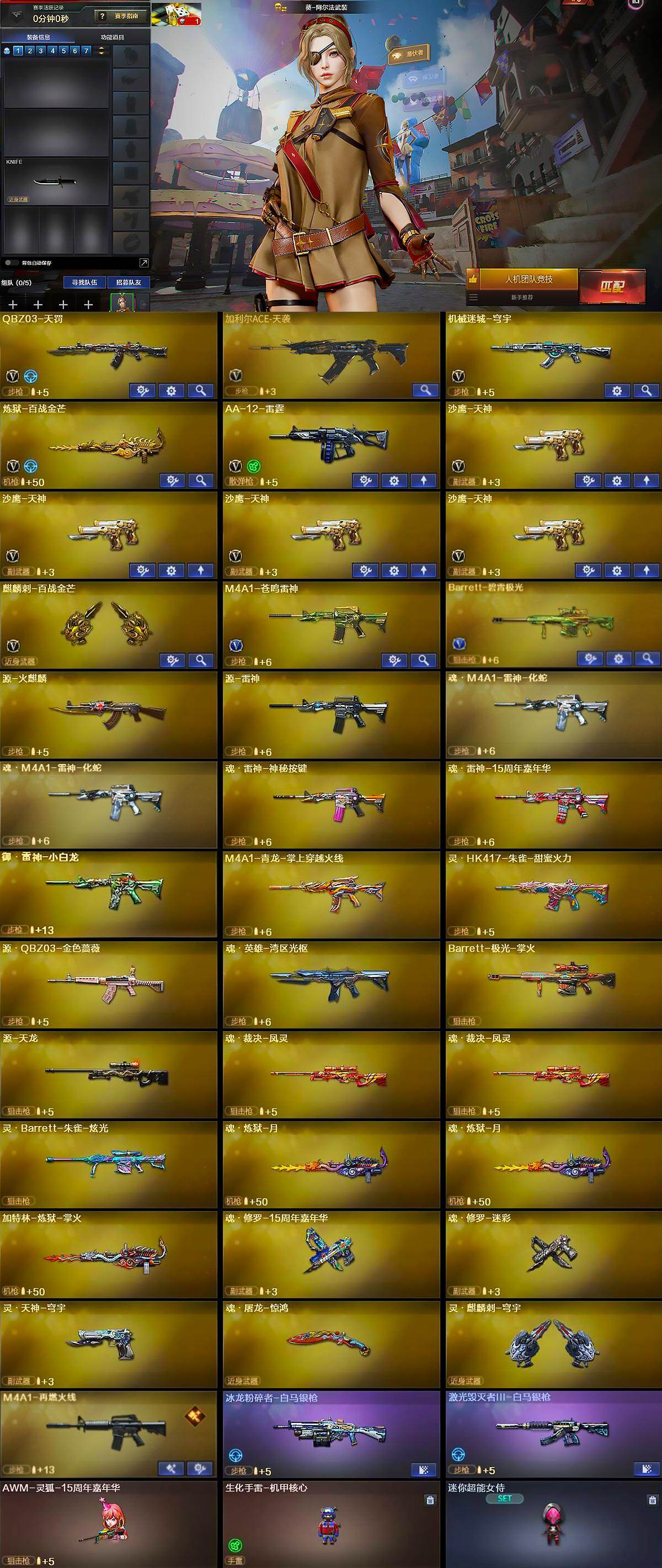 【英雄级武器】:QBZ03-天罚,加利尔ACE-天袭,机械迷城-穹宇,炼狱-百战金芒,AA-12-雷霆,沙鹰-天神*4,麒麟刺-百战金芒,M4A1-苍鸣雷神,Barrett-碧霄极光
