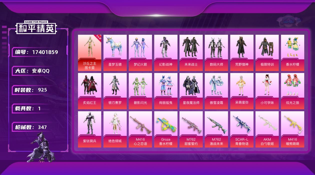 - PX_2101394-??/枪械8/装备297/载具7/战备186/王牌印记14/热力值90329/六级AKM-白勺歌姬/六级SCAR-L-纯梦嫁纱/七级M416-心之恋语/六级GROZA-焦糖拿铁/五级M762-甜心娃娃/一级Kar98K-巳巳如意/一级SLR-暗夜玫瑰/五级DP-28-枪炮玫瑰/兰博SVJ绿色/玛莎拉蒂粉色/海龙奔腾/萌喵橘座/极速兔兔车/萌兔起飞僚机/塞莎霓虹粉/红螳螂/音爆