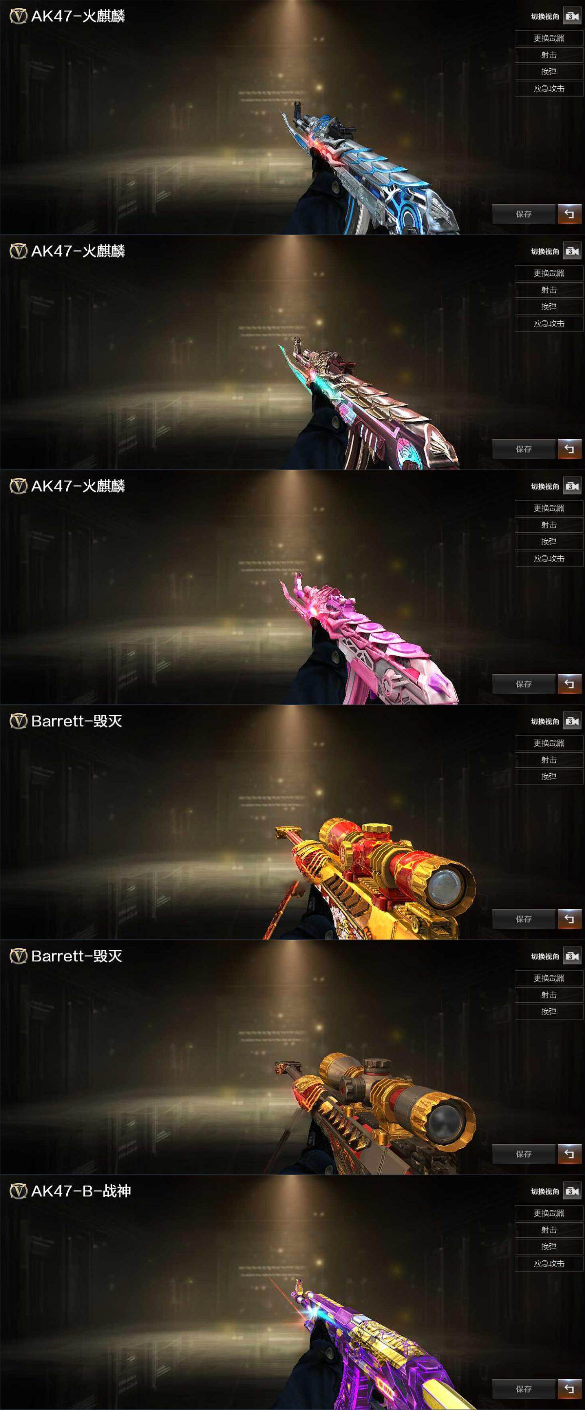 【英雄级武器】:AK47-火麒麟,M4A1-雷神,M4A1-黑骑士,AN94-超新星,M4A1-龙血*3,无影-神兵利器,黑武士-锦绣游龙,QBZ03-金色蔷薇,烈火-动感闪耀,AK-47-猩红传说*3,AK47-B-战神,AWM-天龙,Barrett-毁灭,AWM-裁决*3,Barrett-金色蔷薇,沙鹰-修罗*2,天神-动感闪耀,屠龙*3,麒麟刺,屠龙-动感闪耀,王者之击-觉醒版,手雷-动感闪耀