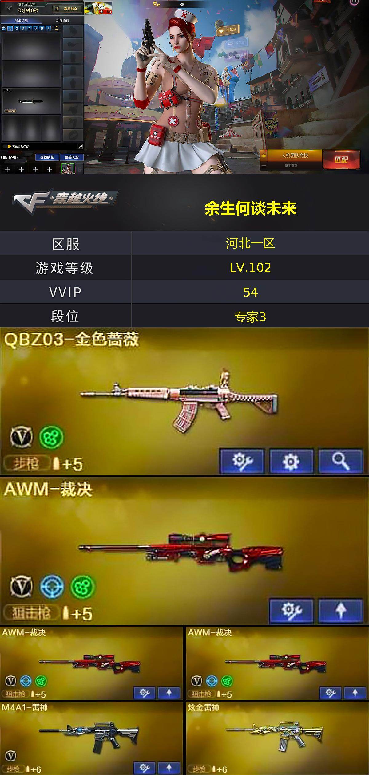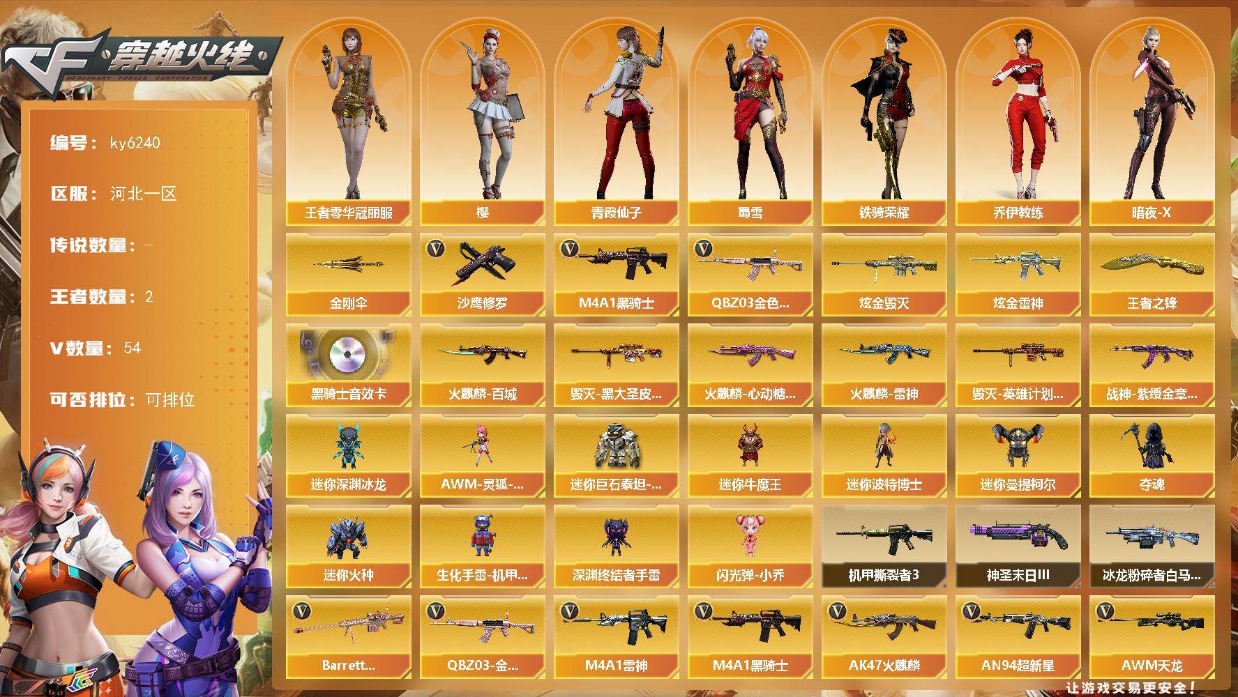 - [15357287]安徽一区-66V-7王者-4炫金 【传说角色】:传说艾莉莎 【热门武器】:QBZ03-金色蔷薇,Scar Light-白虎,M200-幻神,死亡之眼,荣耀世冠-柯尔特,炼狱-迷你小钢,牛牛-AK47,M4A1-黑骑士,汤姆逊-烈龙*6,斯泰尔-蝴蝶*2,降世魔童,USP-雷暴,COP-堕天神,沙鹰-修罗*7 【王者炫金武器】:炫金火麒麟,炫金雷神,炫金毁灭,炫金天龙 【音效卡】:M200-幻神音效卡,M4A1-雷神音效卡,Barrett-毁灭音效卡,Barrett-碧霄极光音效卡*3 【皮肤】:幻神-周瑜皮肤,裁决-胜者为王 皮肤,烈龙-星空,雷神-暗月,雷神-虎将,雷神-R.LGD-CFPLS18冠军,雷神-宇航兔皮肤,雷神-神秘按键 皮肤,火麒麟-冠军之心,火麒麟-百城,毁灭-暗月,毁灭-荣耀之怒,毁灭耀金皮肤,毁灭-黑大圣皮肤,毁灭-英雄计划 皮肤,黑骑士-暗月,黑骑士-冠军之势,无影-暗月,AK47-黑武士-361,AWM-天龙-传奇70KG,极光-能量核心,屠龙-荣耀之锋,龙啸-青青莓果 皮肤 【角色】:鹰,王者春,蛇隐宗,乔伊教练,暗夜-X,北极狐-X,初恋灵狐,嘉年华灵狐,娟娟,葵-赛博朋克,灵狐者-X,灵狐者-黄金海岸,灵狐者-七夕宝贝,曼陀罗-X,潘多拉-X,潘多拉-甜心教官,邱刚敖,青霞仙子,蛇姬,斯沃特-X,蜀雪,铁骑荣耀,雪莉杨,雪莉杨-摸金校尉,樱-战斗天使,职业选手 【人偶武器】:炼狱-迷你小钢,斯泰尔-蝴蝶*2,AWM-灵狐-15周年嘉年华,COP-旗袍,牛牛-AK47,迷你牛魔王,迷你生化手雷,降世魔童 【暴走生化】:死亡之眼,超级对讲机 【挑战大师】:冰龙粉碎者-白马银枪,激光毁灭者III-白马银枪,激光毁灭者III 【英雄级武器】:M4A1-千变,AK47-火麒麟,M4A1-雷神,M4A1-黑骑士,AK47-无影,Scar Light-白虎,QBZ03-金色蔷薇,王者之魄-觉醒版,黑骑士-海王,QBZ-03-王者蔷薇-觉醒版,白虎之魄-觉醒版,AWM-天龙,Barrett-毁灭*2,Barrett-极光,AWM-裁决,M200-幻神,王者之力-觉醒版,炼狱-悦蓝-觉醒版,汤姆逊-烈龙*6,沙鹰-修罗*7,沙鹰-天神*2,USP-雷暴,COP-堕天神,柯尔特-电竞装甲,荣耀世冠-柯尔特,屠龙*2,马来剑-夜魔,擎天,斩神刀-雷暴,