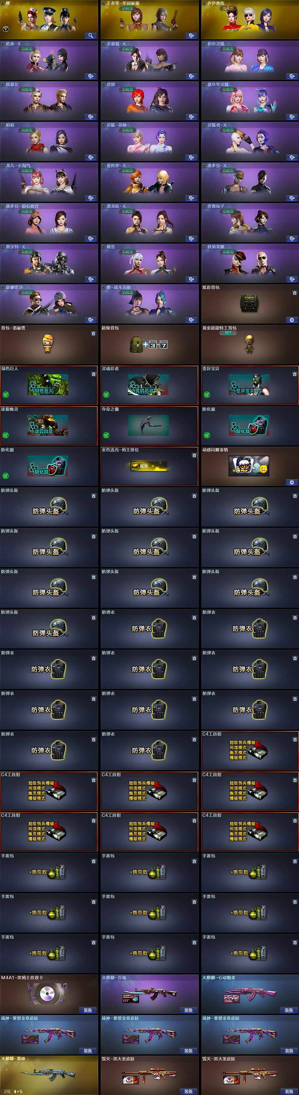 【道具】:炫彩背包,背包-洛丽塔,超级背包,黄金超能特工背包,绿色巨人,灵魂忍者,变异宝贝,迷雾幽灵,夺命之镰,防化服*2,金色流光-枪王排位,动感闪耀表情,防弹头盔*10,防弹衣*10,C4工具钳*7,手雷包*9