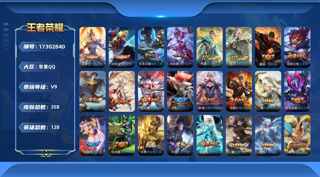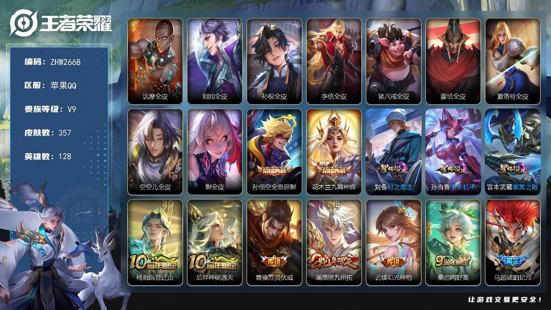 [17302840]苹果Q-V9-最强王者段位-128英雄-357皮肤-2典藏皮肤-30传说-102史诗