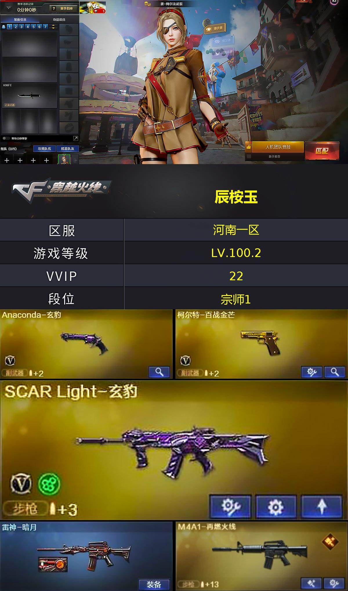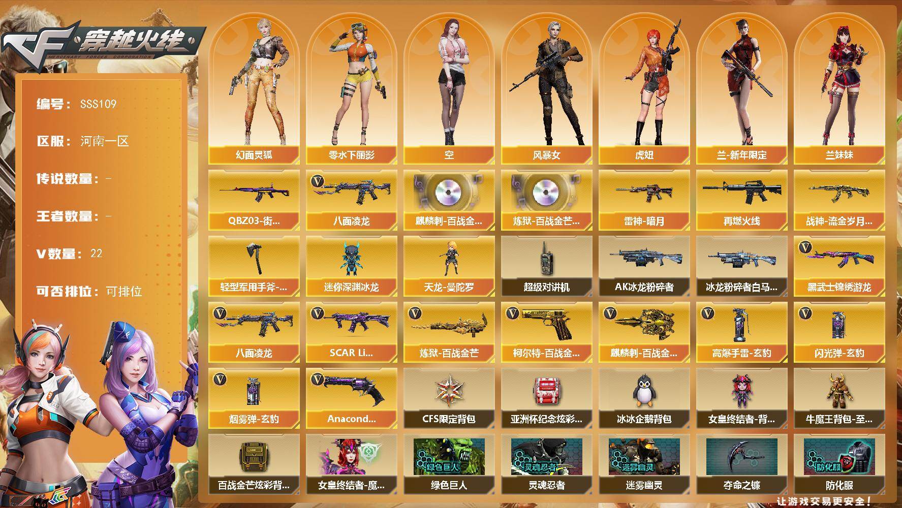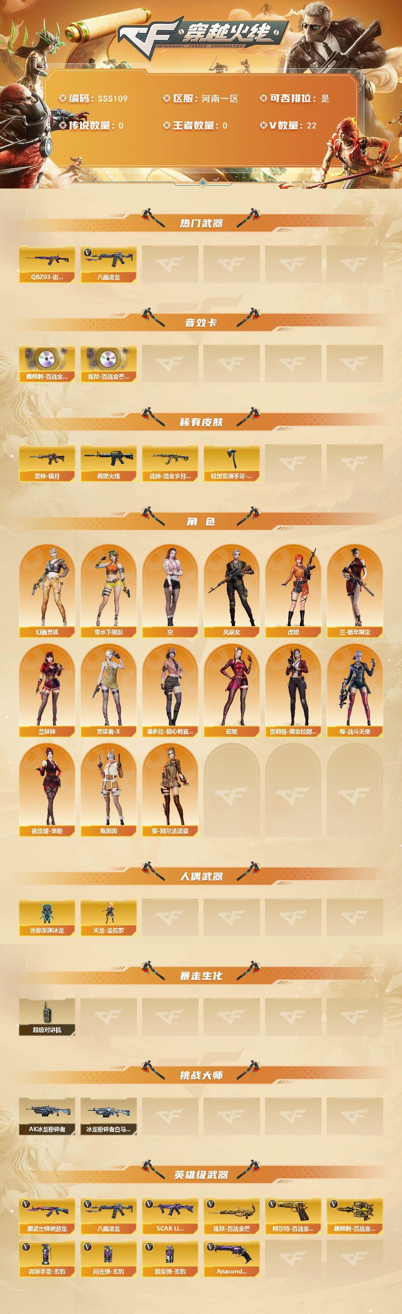 [17402580]河南一区-24V-0王者武器数-0炫金武器数 【热门武器】:八面凌龙,QBZ03-街机 【音效卡】:麒麟刺-百战金芒-盛典舞曲音效卡,炼狱-百战金芒-庆典舞曲音效卡 【皮肤】:雷神-暗月,M4A1-再燃火线,战神-流金岁月皮肤,轻型军用手斧-再燃火线 【角色】:葵-阿尔法武装,幻面灵狐,空,风暴女,虎妞,兰-新年限定,兰妹妹,零-水下丽影,灵狐者-X,潘多拉-甜心教官,蛇姬,兔囡囡,雪莉杨-摸金校尉,夜玫瑰-宠粉,樱-战斗天使 【人偶武器】:天龙-曼陀罗,迷你深渊冰龙*2 【暴走生化】:超级对讲机 【挑战大师】:AK47-冰龙粉碎者,冰龙粉碎者-白马银枪 【英雄级武器】:黑武士-锦绣游龙,八面凌龙,SCAR Light-玄豹,机械迷城-穹宇,炼狱-百战金芒,Anaconda-玄豹,柯尔特-百战金芒,麒麟刺-百战金芒,高爆手雷-玄豹*2,闪光弹-玄豹,烟雾弹-玄豹*3 【道具】:CFS限定背包,亚洲杯纪念炫彩背包,冰冰企鹅背包,女皇终结者-背包,牛魔王背包-至尊黄金,百战金芒炫彩背包,女皇终结者-魔龙之吻,绿色巨人,灵魂忍者,迷雾幽灵,夺命之镰,防化服*3,金色流光-枪王排位,星辰流光-枪王排位,枪王排位28赛季金色流光,枪王排位29赛季金色流光,语音特效-盛典烟火,萌萌小葵表情,EP战队名片,EP战队喷图,C4-红龙,防弹头盔*4,防弹衣*4,C4工具钳*4,手雷包*4 【特殊枪械】: