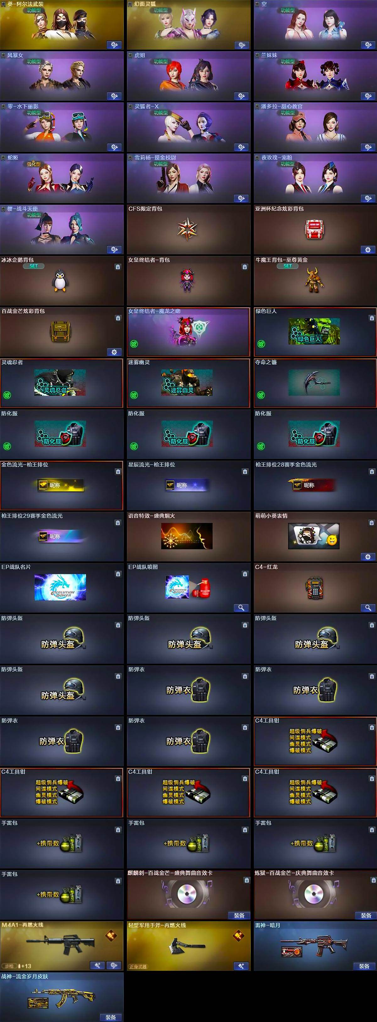 【道具】:CFS限定背包,亚洲杯纪念炫彩背包,冰冰企鹅背包,女皇终结者-背包,牛魔王背包-至尊黄金,百战金芒炫彩背包,女皇终结者-魔龙之吻,绿色巨人,灵魂忍者,迷雾幽灵,夺命之镰,防化服*3,金色流光-枪王排位,星辰流光-枪王排位,枪王排位28赛季金色流光,枪王排位29赛季金色流光,语音特效-盛典烟火,萌萌小葵表情,EP战队名片,EP战队喷图,C4-红龙,防弹头盔*4,防弹衣*4,C4工具钳*4,手雷包*4