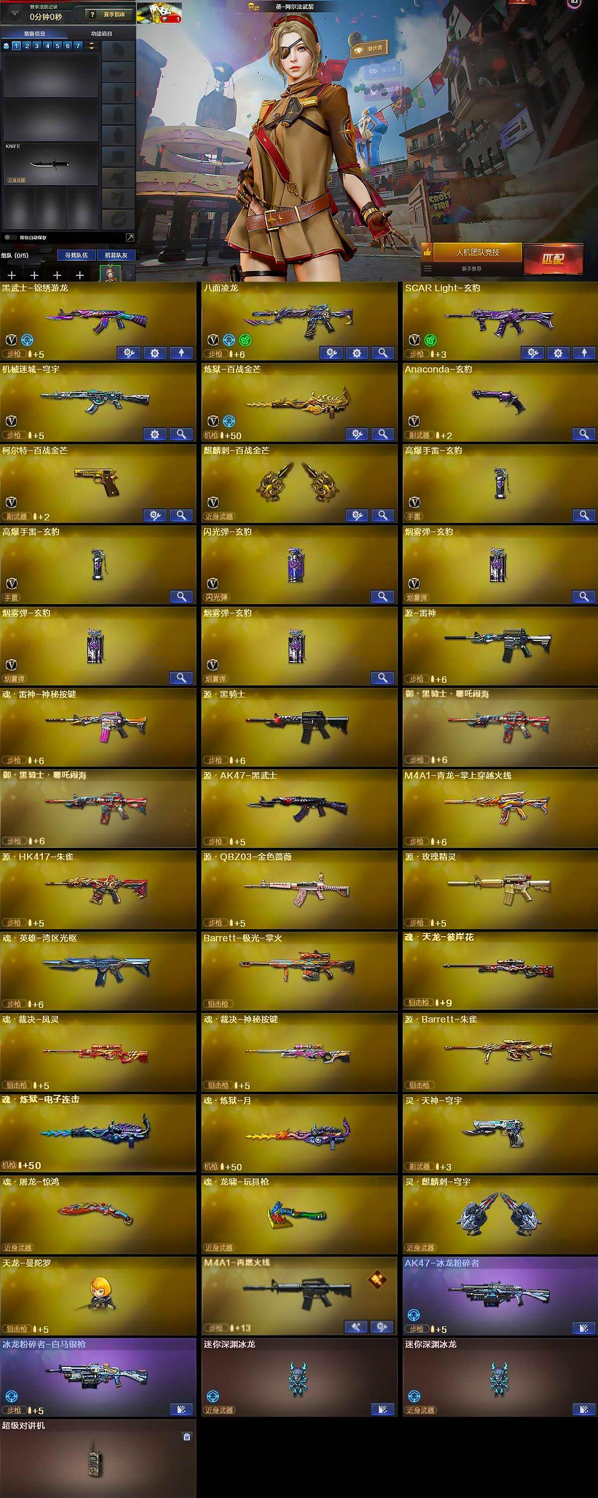 - [16334836]河南一区-18V-9王者-0炫金 【热门武器】:白虎-电玩蓝兔 【音效卡】:炼狱-百战金芒-庆典舞曲音效卡,柯尔特-百战金芒-庆典舞曲音效卡 【皮肤】:白虎-百战金芒 皮肤,金色蔷薇-电竞之星 皮肤,M4A1-再燃火线,雷神-神秘按键 皮肤,毁灭-虹光风暴 皮肤,轻型军用手斧-再燃火线 【角色】:玄豹,修道士,暗夜-X,初恋灵狐,零-水下丽影,潘多拉-甜心教官 【人偶武器】:迷你宝贝,迷你地狱终结者,AWM-灵狐-15周年嘉年华*2,生化手雷-机甲核心 【挑战大师】:冰龙粉碎者-白马银枪,激光毁灭者III-白马银枪 【英雄级武器】:M4A1-雷神,QBZ03-独角-IV,黑骑士-海王,白虎-电玩蓝兔,王者之决-觉醒版,炼狱-百战金芒,擎天,麒麟刺-百战金芒,丛林匕首-玄豹,高爆手雷-玄豹,M4A1-苍鸣雷神,Barrett-碧霄极光 【道具】:BS战队炫彩背包,百战金芒炫彩背包,超级背包,迷你冰龙背包,女皇终结者-魔龙之吻,绿色巨人,灵魂忍者,迷雾幽灵,夺命之镰,防化服*3,语音特效-盛典烟火,萌萌小葵表情,防弹头盔,防弹衣,C4工具钳,手雷包 【特殊枪械】: